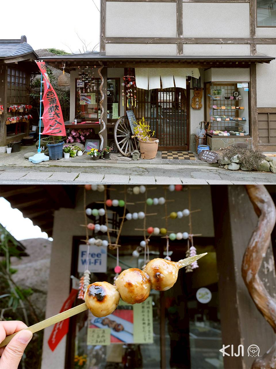 ไต่เขาขึ้นลงรวม 2,000 กว่าขั้น ร่างกายใช้พลังงานไปไม่น้อย แวะกินขนมดังของท้องถิ่นกันหน่อยดีกว่า เป้าหมายของเราคือ Taimenseki ร้านที่อยู่ติดกับ Kofuku no Kane ระฆังที่จะนำโชคมาให้ผู้ที่สั่นระฆัง 2 ครั้ง ที่นี่เป็นร้านขายโซบะซึ่งมีดังโงะหลายรสให้เลือก จะนั่งในร้านหรือยืนกินด้านนอกเป็น Dango Stand เก๋ๆ ก็ได้ ถ้าชอบถั่วแนะนำให้สั่งถั่วซุนดะดังโงะ ถั่วดังของโทโฮคุ แต่เราแอบเป็นแฟนคลับของคุณมัตซึโอะ บะโช ก็เลยสั่งบะโชยากิดังโงะราดซอสถั่ววอลนัทเพื่อระลึกถึงกวีคนโปรดสมัยเรียน แล้วตบด้วยน้ำผลไม้รวมของดังในยามาหาตะจากร้านขายของฝาก Endo ตรงสะพาน