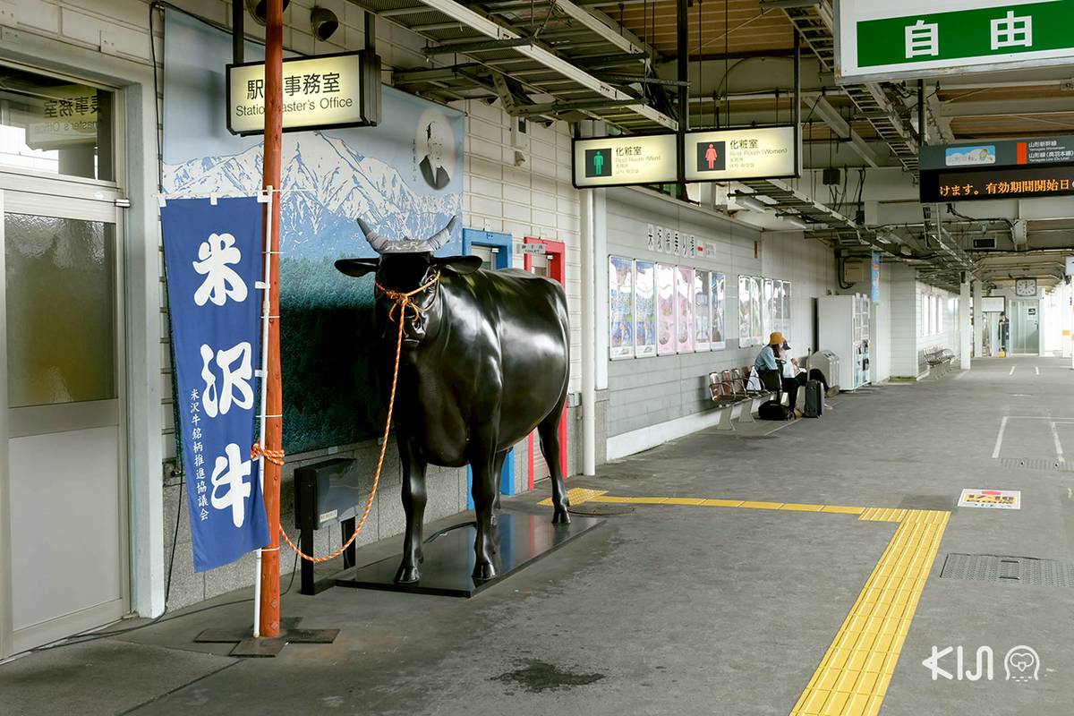 ถ้าจะเปิดทริปให้สวย ก็ต้องเริ่มที่อาหารรสเลิศ คนไทยอย่างเราถวิลหาเนื้อวัวชั้นยอดอยู่แล้ว ดังนั้นห้ามพลาด ‘เนื้อโยเนซาวะ (Yonezawa Beef)’ ของดังประจำเมืองเขาเด็ดขาด เนื้อที่นี่พิเศษกว่าเนื้ออื่นตรงที่วิธีเลี้ยงซึ่งเน้นการขุนอย่างประคบประหงมตลอดระยะเวลา 33 เดือน เนื้อวัวที่นี่ดังไม่ดังเอาเป็นว่าแค่ลงรถไฟที่สถานีโยเนซาวะ (Yonezawa Station) ก็เจอรูปปั้นน้องวัวต้อนรับแล้ว จะเดินออกไปทางออกก็เจอร้านเบนโตะข้าวหน้าเนื้อดักอีก เห็นราคาย่อมเยาแล้วอย่าเพิ่งตื่นเต้นควักเงินให้เขาไป ขอให้ทำใจแข็งแตะตั๋วออกมานอกสถานี เดินตรงไปไม่ถึง 5 นาทีจะได้พบกับร้าน Gyunabe O-ki อันเป็นจุดหมายปลายทางของเรา