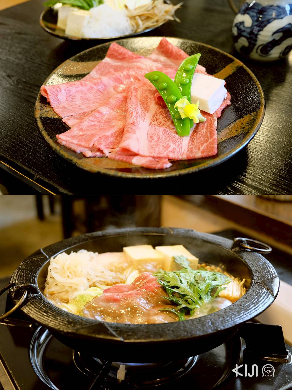 ร้านนี้ดีเด่นเรื่องเนื้อ แต่เมนูที่ขึ้นชื่อที่สุดของร้านคือสุกียากี้ เราเลือก Shimofuri Sukiyaki Set (4,800 เยน) เซ็ตอลังสุดสำหรับมื้อกลางวันที่เนื้อมีมันแทรกมากกว่าเซ็ต Akami Sukiyaki Set (4,300 เยน) ถ้าเนื้อในเซ็ตไม่พอสามารถสั่งเพิ่มได้ตามใจชอบ เมื่อเตรียมวัตถุดิบ อุปกรณ์พร้อมหมดแล้ว พนักงานจะยกมาเสิร์ฟให้พร้อมจัดแจงนำลงไปย่างในหม้อ บรรจงนำผักแต่ละชนิดลงไปผัด จากนั้นถึงค่อยนำเนื้อไปเรียงให้อย่างสวยงาม ราดซอสสุกียากี้และจบด้วยการใส่วุ้นเส้นและเต้าหู้ เสียงฉู่ฉี่ของกระทะเคล้าภาพอาหารที่อยู่ด้านหน้าทำให้ทุกอย่างน่ากินขึ้นไปอีก เรามีหน้าที่แค่กินให้อร่อยและเติมน้ำซุปเมื่อมันงวดไปเท่านั้น!