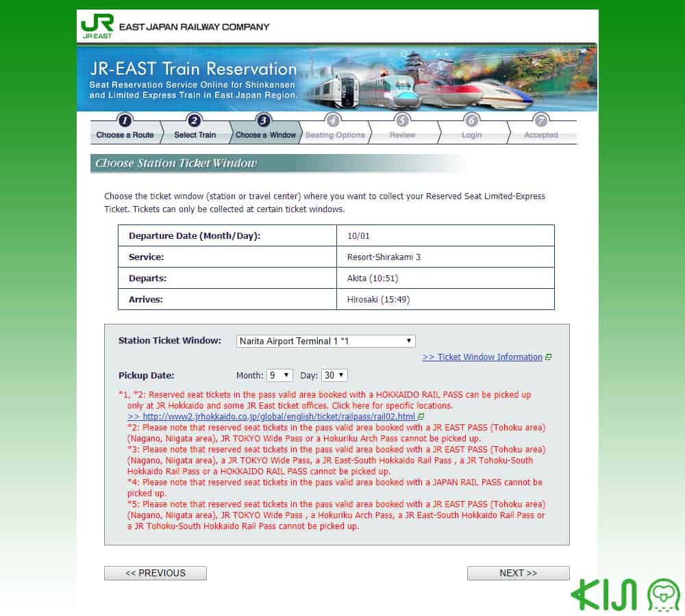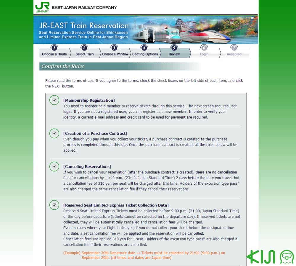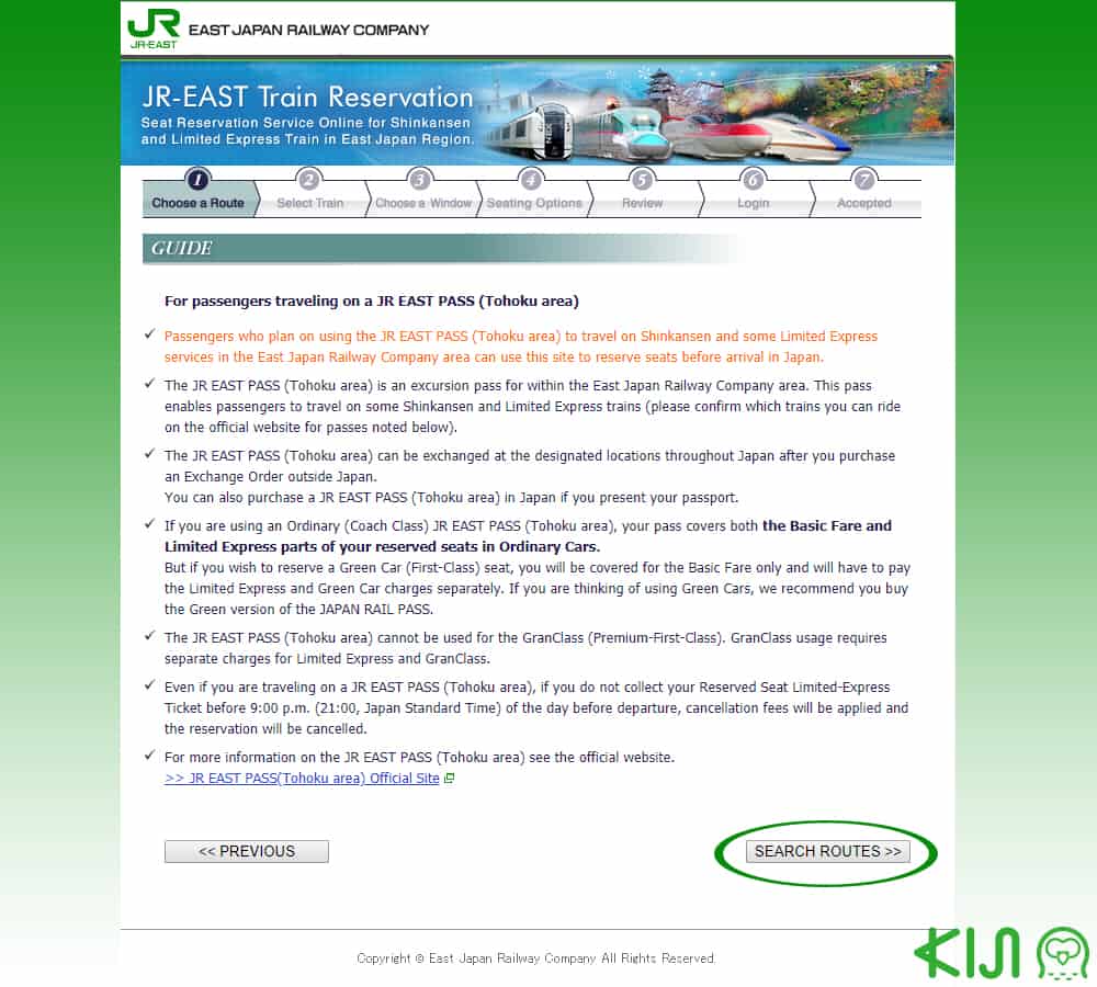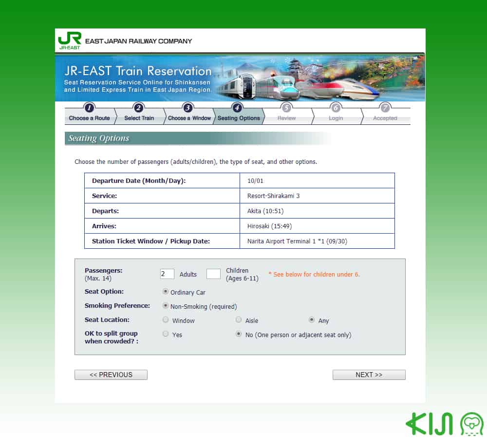 จะปรากฏหน้าต่างให้ใส่จำนวนผู้โดยสาร ช่องผู้ใหญ่และเด็ก (ตัวอย่างเลือกผู้ใหญ่ 2 คน) ถัดมาเป็นส่วนประเภทของที่นั่ง ซึ่งส่วนใหญ่จะเลือกได้เพียง Ordinary Car (รถไฟธรรมดา) เพียงอย่างเดียว หากปรากฏตัวเลือก Green Car (รถไฟพิเศษ) จะต้องเสียเงินเพิ่ม ถัดมาจะเป็นที่นั่งแบบห้ามสูบบุหรี่หรือสูบบุหรี่ได้ ซึ่งส่วนใหญ่จะเลือกได้แค่ที่นั่งห้ามสูบบุหรี่ ถัดมาเป็นตำแหน่งที่นั่ง ริมหน้าต่าง ริมทางเดิน หรือ แบบใดก็ได้ (ตัวอย่างเลือกแบบใดก็ได้) และตัวเลือกสุดท้ายถามว่า ยินดีให้แยกที่นั่งหรือไม่ (ตัวอย่างเลือก “ไม่”) จากนั้นกดปุ่ม NEXT