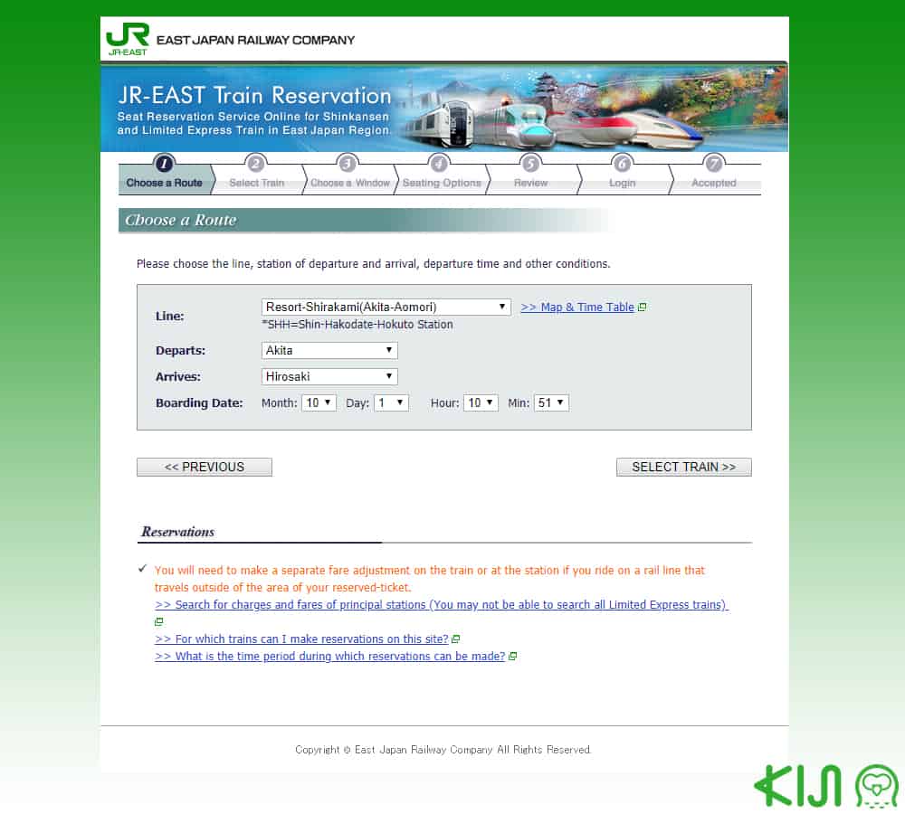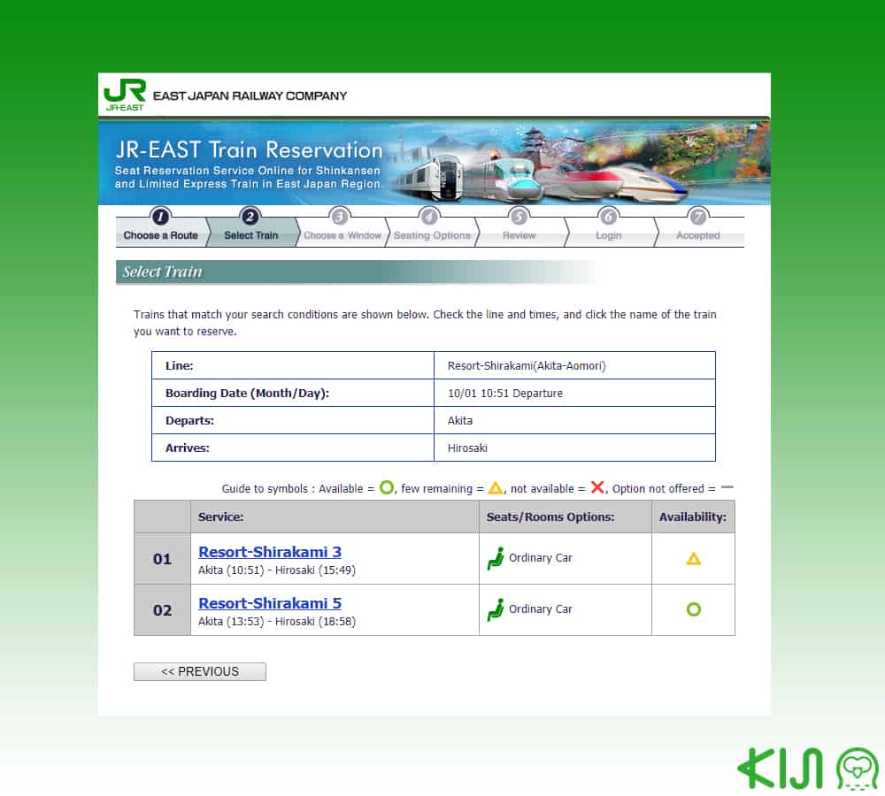 จะปรากฏหน้าต่างสรุปรายละเอียดรถไฟตามช่วงเวลาเราเลือกและมีขบวนต่างๆ ปรากฏให้เราเลือก ถ้ามีสัญลักษณ์วงกลม หมายถึง ยังมีที่ว่างอีกเยอะ ถ้ามีสัญลักษณ์สามเหลี่ยม หมายถึง มีที่นั่งเหลือน้อยแล้ว และถ้าเป็นกากบาท หมายถึง เต็มแล้ว ให้กดชื่อรถไฟที่ขึ้นเป็นตัวอักษรสีน้ำเงิน (ในรูปตัวอย่าง เลือกขบวน Resort-Shirakami 3 ซึ่งเหลือที่นั่งไม่มาก)