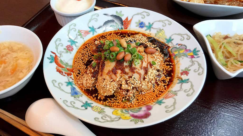 Yodare Tori Lunch Set (วันธรรมดา 1,200 เยน) เซ็ตอาหารจีนเสฉวนเมนูขึ้นชื่อของทางร้านที่หมักไก่ด้วยน้ำสมสายชูดำกับน้ำมันพริกเผาพร้อมเครื่องเทศกว่า 15 ชนิด เสิร์ฟพร้อมซุป, ข้าวสวย และจานเรียกน้ำย่อย ถือเป็นจานเด็ดแบบพรีเมียมที่หารับประทานได้ยาก