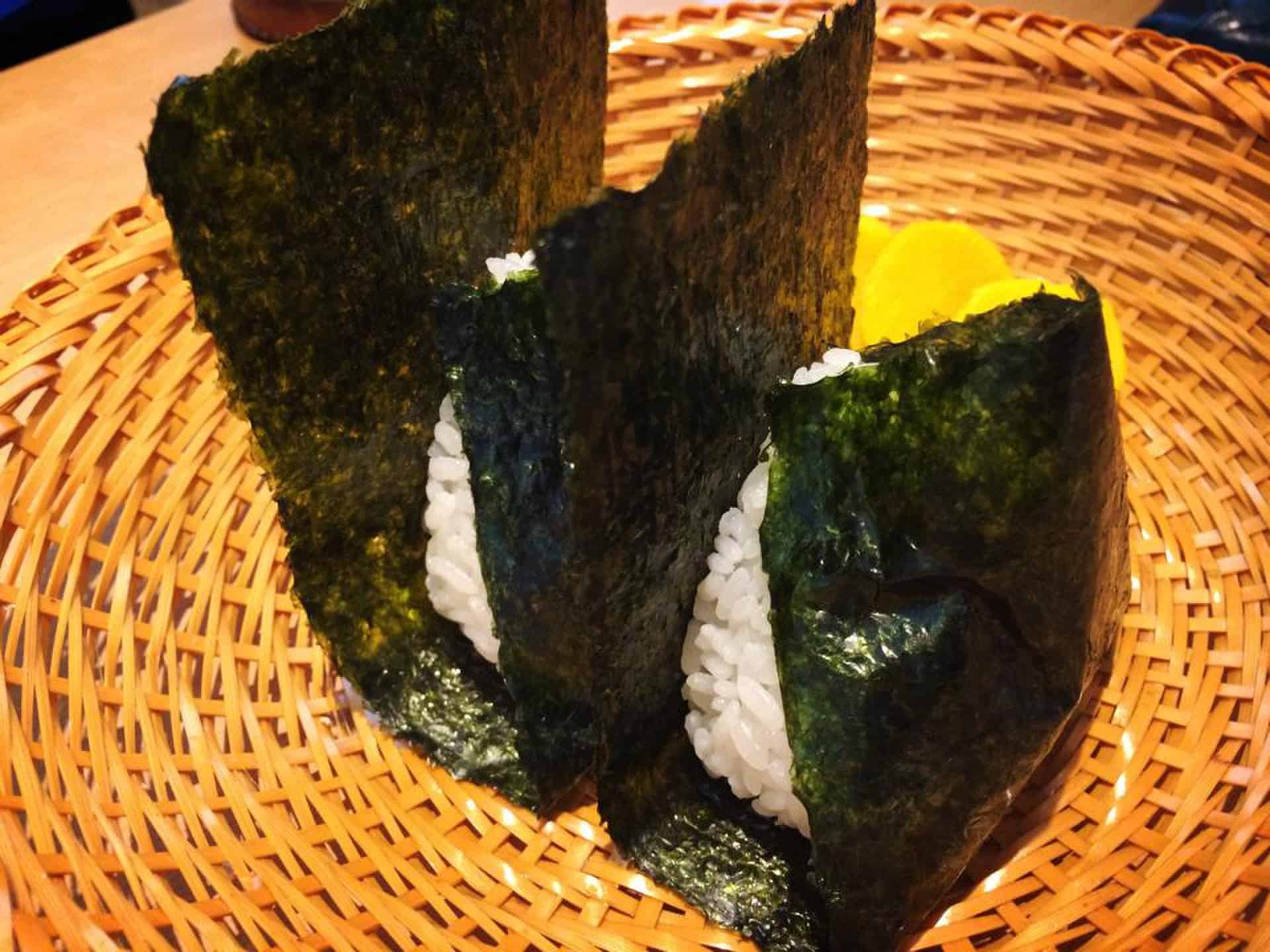โอนิกิริ 2 ก้อน เสิร์ฟพร้อมหัวไชโป๊วและซุปมิโซะ (เริ่มต้น 748 เยน) ใช้ข้าวโคชิฮิคาริหุงใหม่จากหม้อขนาดใหญ่ นำมาพันรอบด้วยสาหร่ายเอโดะมาเอะ สอดไส้ด้วยวัตถุดิบที่ล้วนแต่คัดสรรมาอย่างพิถีพิถัน ไม่ว่าจะเป็นไข่ปลาแซลมอน, รากโกโบ, สาหร่ายคอมบุ ฯลฯ เกิดเป็นข้าวปั้นสามเหลี่ยมที่อัดแน่นไปด้วยรสชาติและกลิ่นอายของความเป็นโตเกียวอยู่เต็มเปี่ยม