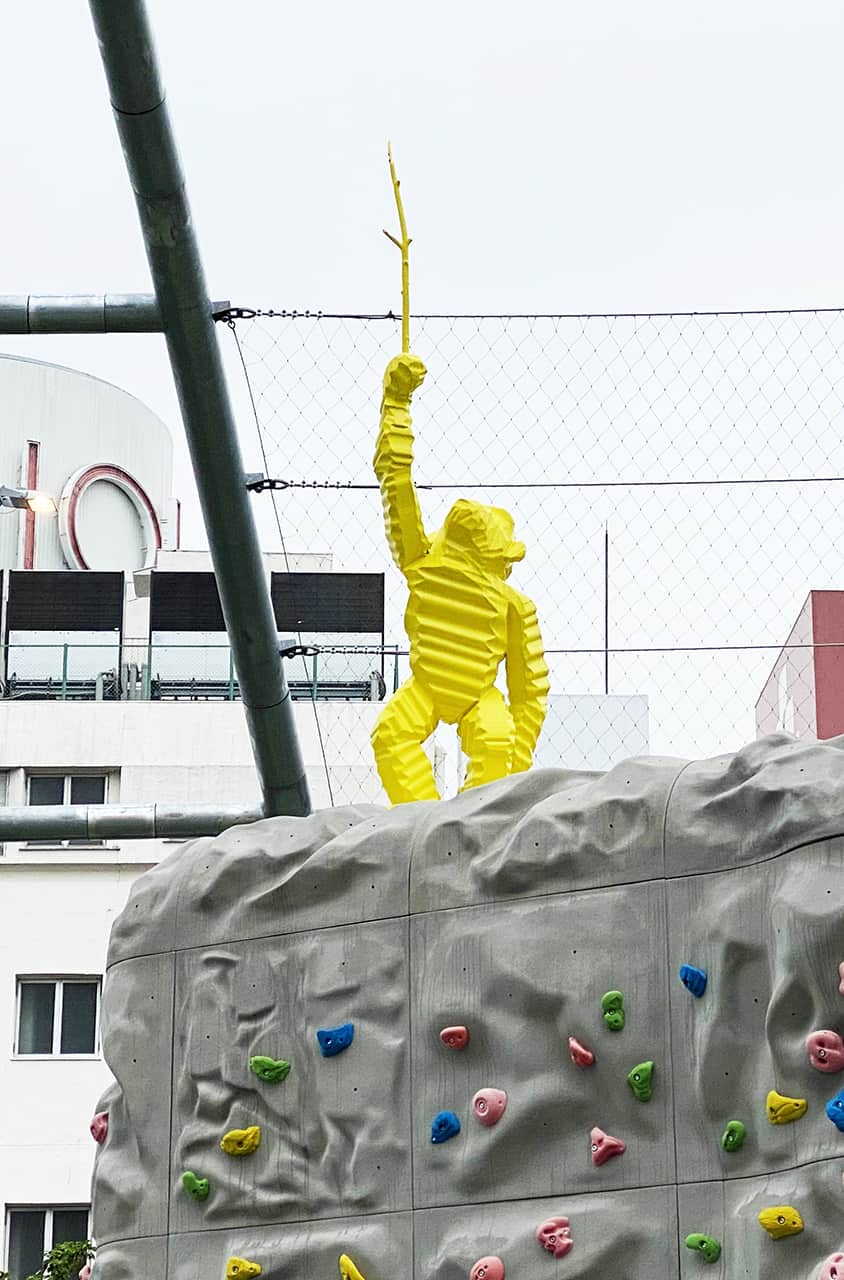 รูปปั้นลิงถือกิ่งไม้ที่อยู่บนกำเเพงหินจำลองในสวยลอยฟ้ามิยาชิตะเป็นรูปปั้นที่สื่อความหมายถึงการสร้างขวัญกำลังใจให้กับผู้คนมากมายที่มาเยี่ยมเยือนสวนสาธารณะแห่งนี้ หรือคิดง่ายๆ ก็คือน้องลิงที่คอยให้กำลังใจผู้คนจากทั่วสารทิศที่มาเยี่ยมเยือนสวนแห่งนี้นั่นเอง