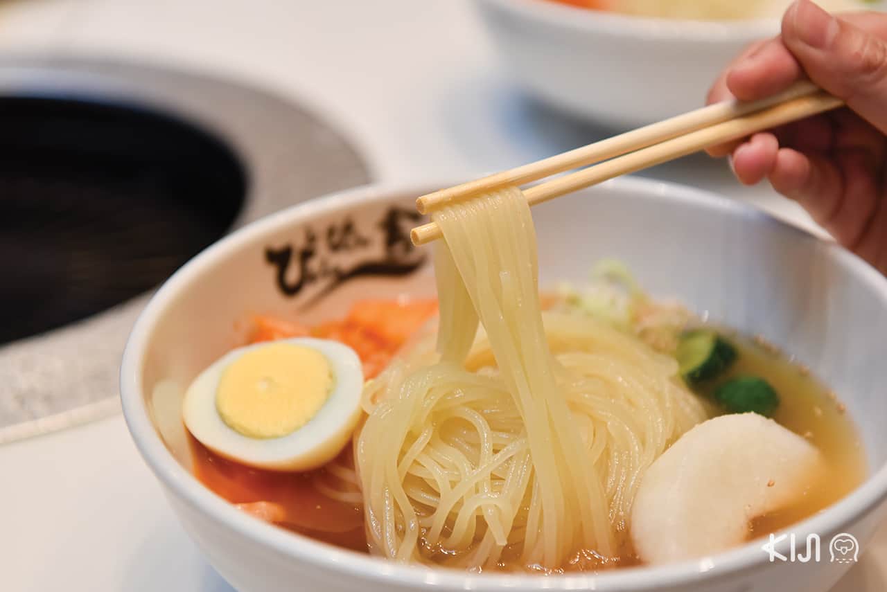 ที่ร้านมีบริการทั้งแบบชุดเซ็ตมาพร้อมทั้งเนื้อและเส้นเรเมน หรือจะสั่งแยกก็ได้เช่นกัน ว่าด้วยเรื่องรสชาติ เราชอบสัมผัสของเส้นที่เหนียวนุ่ม ซึ่งทำจากแป้งมันฝรั่งเคลือบด้วยน้ำมันงาเสิร์ฟมาในซุปใสเย็นๆ ท็อปด้วยกิมจิ แตงกวา เนื้อสไลซ์ไข่ต้ม ที่ขาดไม่ได้เลยคือผลไม้หั่นชิ้นอย่างแตงโมหรือลูกแพร์ สำหรับเรารู้สึกว่ารสชาติแปลกนิดหน่อย แต่เพื่อนที่ไปด้วยกันบอกว่ากินแล้วก็สดชื่นคล่องคอดี