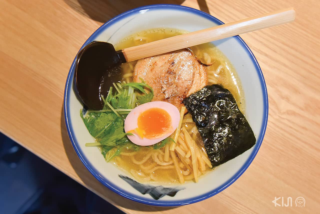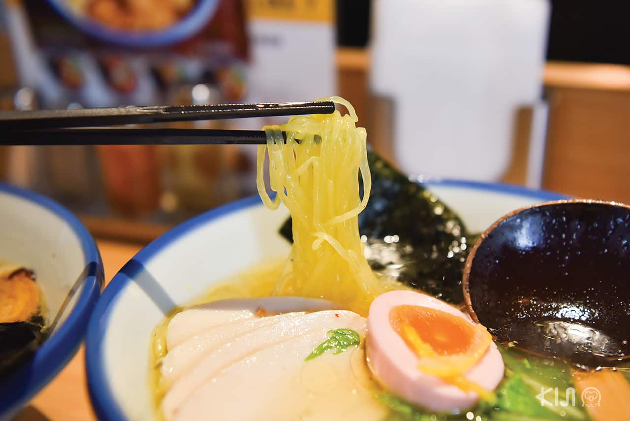 ต่อมาเลือกระดับความมันของซุปไก่ (Chi-yu) ได้ 2 แบบคือ Tanrei ระดับความมันที่ทางร้านกำหนดมาให้อย่างพอดี หรือถ้าชอบซุปราเมนที่มันๆ ให้เลือกแบบ Maroaji ซึ่งจะเข้มข้นขึ้นกว่า Tanrei ในชามยังมีหน่อไม้ญี่ปุ่น, ไข่ต้ม, ผักมิซูนา และสาหร่ายให้มาอีกด้วย