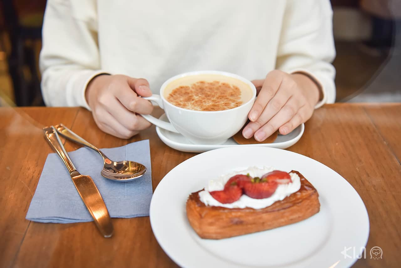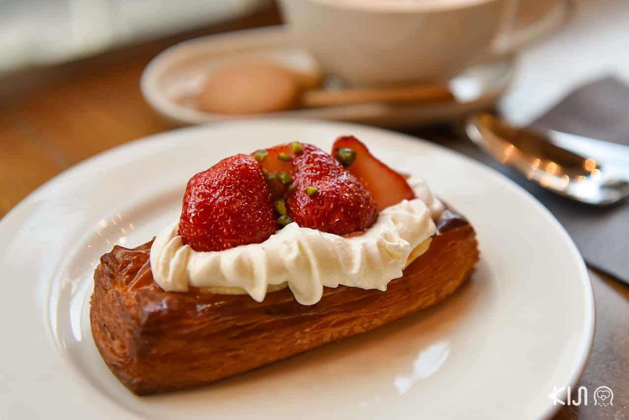แป้งเดนิชหนากรอบกัดให้เต็มคำพร้อมกับครีมและสตรอว์เบอร์รีด้านบน รสชาติความกรอบของแป้งบวกกับครีมนุ่มๆ ที่ไม่หวานเกินไปและตัดเลี่ยนด้วยรสเปรี้ยวของสตรอว์เบอร์รีในคำเดียว บอกเลยว่าอร่อยสุดๆ