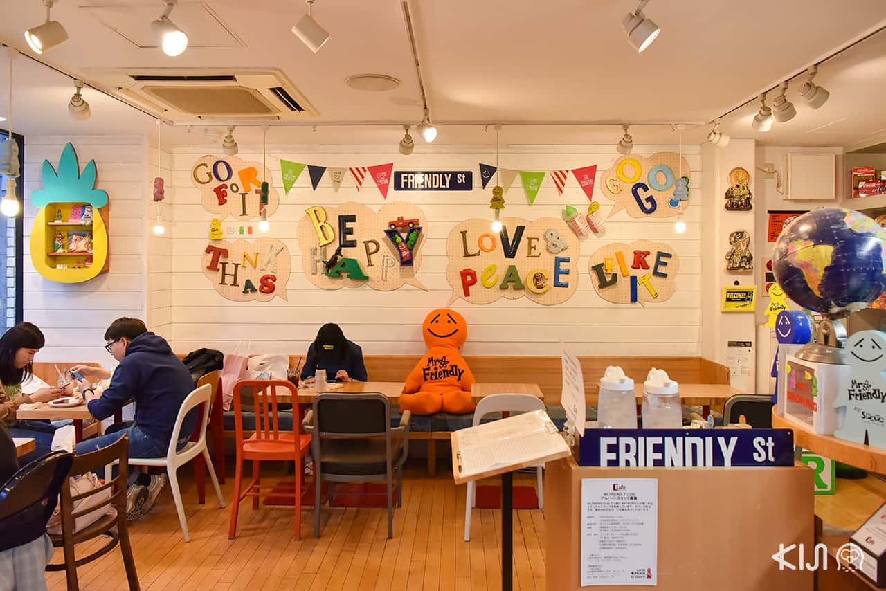 มารับความสุขเติมความสดใสให้กับตัวเองกันหน่อย ปิดท้ายด้วยร้านที่ต้องหยุดเดินต่อและขอแวะเข้าสักนิด เพราะสะดุดตากับสีสันของป้ายชื่อร้าน คาเฟ่ขนาดเล็กแต่เต็มไปด้วยรอยยิ้มและความสดใส บรรยากาศน่านั่งสบายๆ ฟรี Wi-Fi จะนั่งทานในร้านหรือซื้อกลับก็ได้ ตั้งแต่หน้าร้านจนถึงด้านในร้านจะสังเกตเห็นหน้าตายิ้มแย้มของมาสคอตตัวหนึ่ง เขามีชื่อว่า Mr. Friendly ผู้เป็นมิตรและมีรอยยิ้มให้ทุกคนเสมอ เขาต้องการส่งความสุขให้ทุกๆ คนทั่วโลก แม้ว่าจะอยู่กันคนละประเทศ พูดกันคนละภาษาก็สามารถยิ้มแย้มให้กันได้