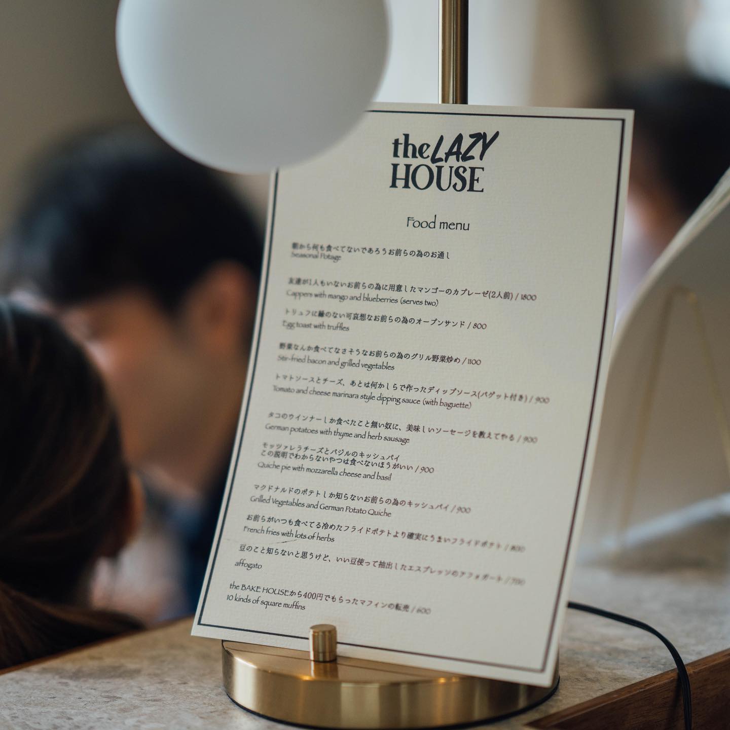 ร้านอาหาร The Bake House ที่เมื่อตกเย็นจะกลายเป็นร้าน The Lazy House มีคอนเซ็ปต์ที่ตรงกันข้ามกับคาเฟ่แรกโดยสิ้นเชิงคือ ปฏิบัติต่อลูกค้าอย่างขี้เกียจหรือ 態度が悪い taido ga warui ซึ่งหมายถึงการประพฤติตัวไม่ดีหรือไม่มีมารยาทนั่นเอง ฉะนั้นเมื่อเราก้าวเข้าไปในร้าน เราจะถูกต้อนรับด้วยกิริยาท่าทางเเละคำพูดที่ไม่น่ารักต่างๆ เช่น “เดินเร็ว ๆ หน่อย”, “นั่งตรงนั้น!” แทนที่จะเป็นคำว่า いらっしゃいませ Irashaimase แบบที่พูดกันตามร้านอาหารญี่ปุ่นทั่วไป
