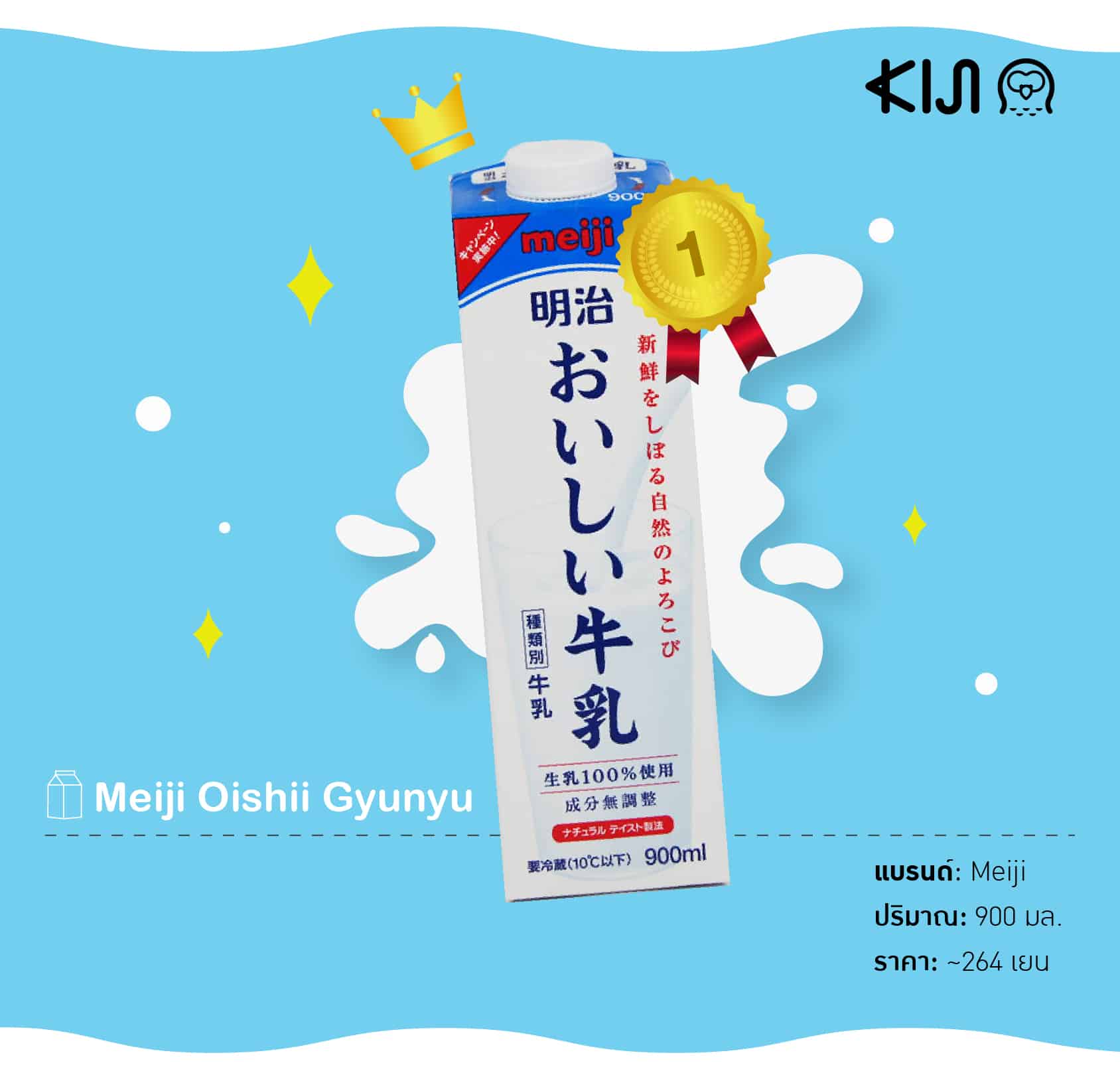 สำหรับอันดับหนึ่งคงหนีไม่พ้น Meiji Oishii Gyunyu จากบริษัท เมจิ จำกัด หนึ่งในนมสดที่ครองใจคนญี่ปุ่นมากที่สุด เปิดตัวทั่วประเทศมาตั้งแต่ปี ค.ศ. 2002 แต่เดิมนมวัวจะถูกจำกัดวัตถุดิบแค่เฉพาะน้ำนมดิบเท่านั้น ทำให้ยากที่จะเข้าใจถึงความแตกต่างในรสชาติ แต่เมจิใช้วิธีการผลิตแบบ “Natural Taste” คือการลดออกซิเจนในน้ำนม ก่อนจะนำไปเพิ่มความร้อนพร้อมฆ่าเชื้อ ทำให้ได้รสชาติของนมสดที่เข้มข้น มาในขนาด 900 มิลลิลิตรแบบเต็มกล่อง และแพ็กเกจลักษณะสีขาวทึบดูสะอาดตานี้ จะช่วยป้องกันแสงที่ส่งผลต่อการกักเก็บคุณภาพของนมได้อีกด้วย แถมตัวกล่องยังออกแบบมาให้ง่ายต่อการแกะรีไซเคิล เรียกว่าทั้งอร่อย และใส่ใจสิ่งเเวดล้อมสุดๆ