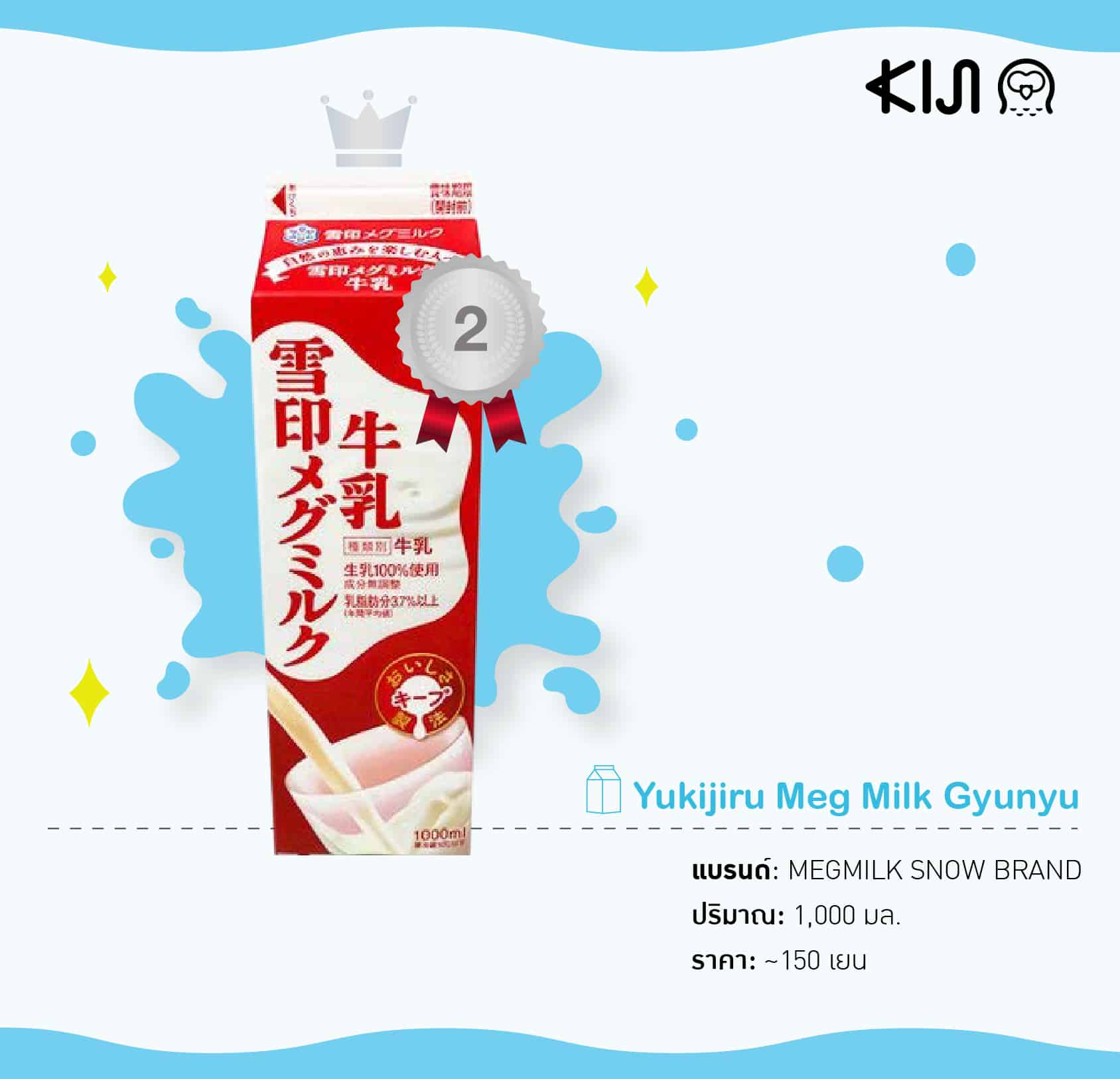 ถัดมาที่อันดับสอง นมสดจากแบรนด์ Megmilk Snow Brand บริษัทผลิตนมที่มีชื่อเสียงและยังถือเป็นสัญลักษณ์ของฮอกไกโด สังเกตุบริเวณหน้ากล่องจะมีสัญลักษณ์กลมๆ เล็กที่เขียนว่า “Oishisa Keep”หมายถึงวิธีการเก็บรักษาความอร่อยของนม โดยเก็บน้ำนมไว้ในอุณหภูมิต่ำกว่า 10 องศาเซลเซียส เพื่อกำจัดออกซิเจนแบบฉับพลัน ซึ่งออกซิเจนเป็นตัวการที่ทำให้เกิดการขึ้นหืนนั่นเอง