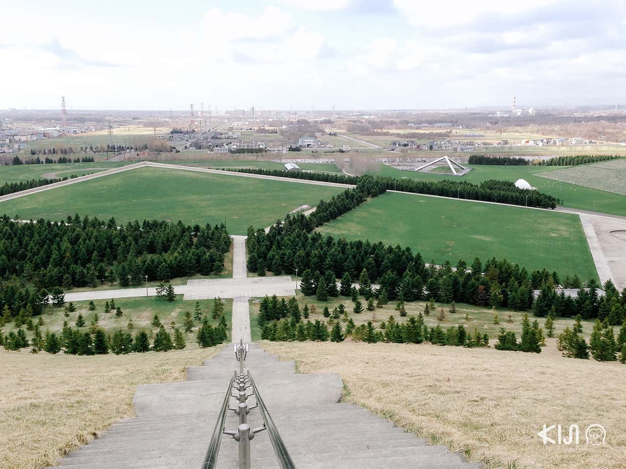 เมื่อยจากจุดนี้เราสามารถมองเห็นวิวเมืองซัปโปโรแบบพาโนราม่าได้ พร้อมทุ่งหญ้าเขียวขจีที่มีฝูงแกะสีน้ำตาลอยู่ละแวกใกล้ๆ บริเวณใกล้เคียงยังเป็นจุดจำหน่ายแบบฟอร์มราคา 100 เยน ให้เราเขียนอะไรก็ได้ที่มีความมุ่งมั่นอยากจะทำ เขียนเสร็จก็หย่อนลงช่องใต้แท่นศิลาได้เลย
