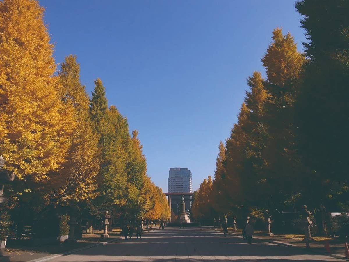 ศาลเจ้ายาสุกุนิถือเป็นศาลเจ้าชินโตขนาดใหญ่ที่สุดใน โตเกียว ทั้งยังเป็น จุดชมใบไม้เปลี่ยนสี ที่งดงามไม่แพ้สถานที่ดังๆ อีกด้วย ซึ่งในช่วงฤดูใบไม้ร่วงบริเวณหน้าเสาโทริอิขนาดใหญ่ของศาลเจ้ายาสุกุนิที่เรียงรายไปด้วยต้นแปะก๊วยทอดยาวไปประมาณ 240 เมตร เมื่อถึงช่วงพีคบรรดาต้นแปะก๊วยโดยรอบจะพร้อมใจกันเปลี่ยนสีสันเป็นสีเหลืองทองปกคลุมพื้นที่สองข้างทางกลายเป็นทิวทัศน์งดงามเคียงคู่ศาลเจ้าที่เก่าแก่แห่งนี้