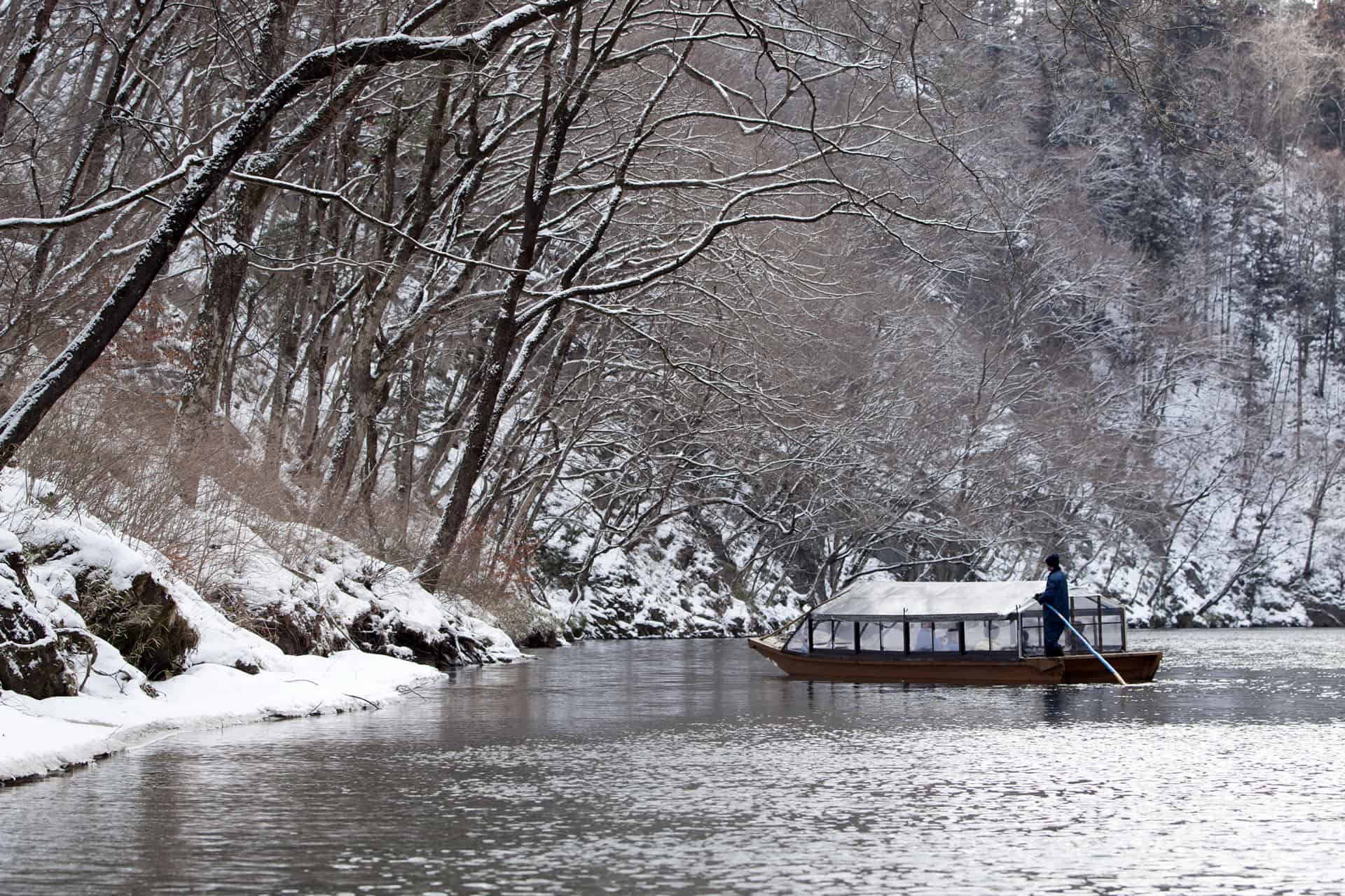 เรือนำเที่ยวพาชมธรรมชาติในฤดูหนาวที่สวยงามของหุบเขาเกบิเค ที่มาภาพ: geibikei.co.jp