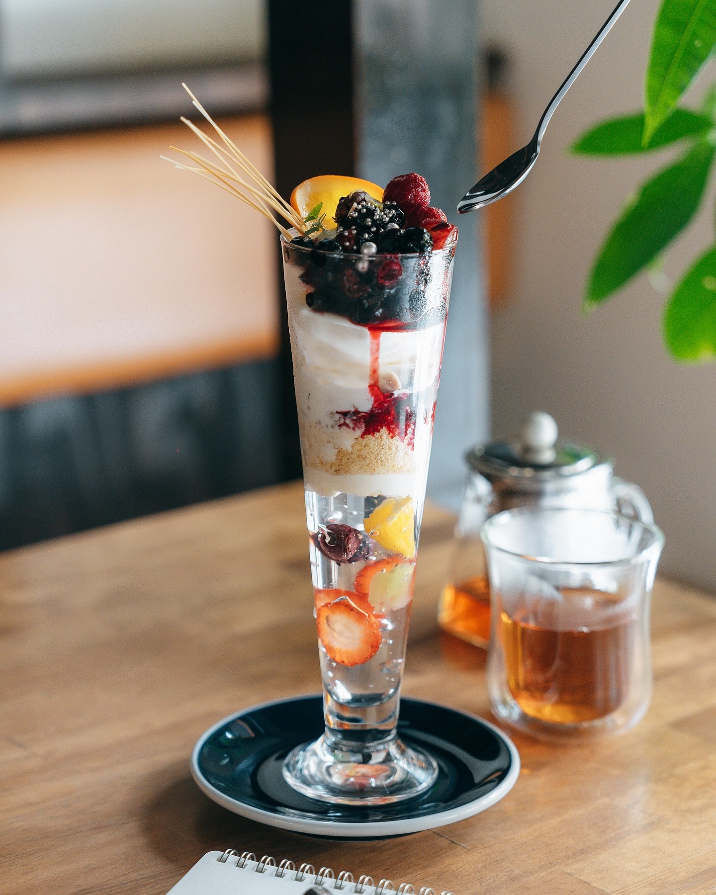 คาเฟ่ที่นี่ขึ้นชื่อเรื่องของหวานเเละผลไม้สด ดังนั้นเมนูที่ต้องสั่งเลยคือ “พาร์เฟ่ต์ผลไม้สด” ซึ่งมีเมนูให้เลือกหลากหลายเลย เช่น พาร์เฟ่ต์สตรอเบอร์รี่และราสเบอร์รี่, พาร์เฟ่ต์ลูกเรดเคอแรนท์และบลูเบอร์รี่จากจังหวัดนากาโน่ เป็นต้น