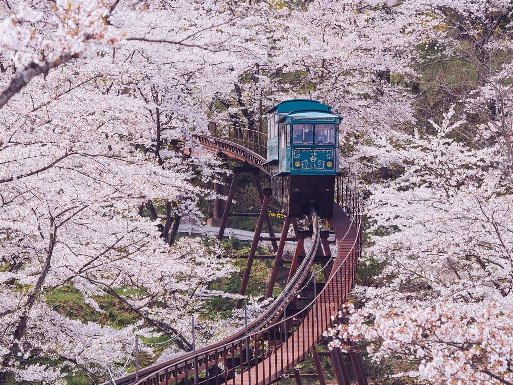 ไฮไลท์ของที่นี่คือรถรางย้อนยุค ค่าบริการคนละ 500 เยน ที่จะพาเราเลาะลอดผ่านดงซากุระที่โอบล้อมมาจากทุกทิศทางคล้ายอุโมงค์ ระยะทางประมาณ 300 เมตร ขอบอกว่าถ้ามาถึงที่นี่แล้วยังไงก็ต้องลองนั่งรถรางขบวนนี้ และอย่าลืมถ่ายรูปเป็นที่ระลึกด้วย