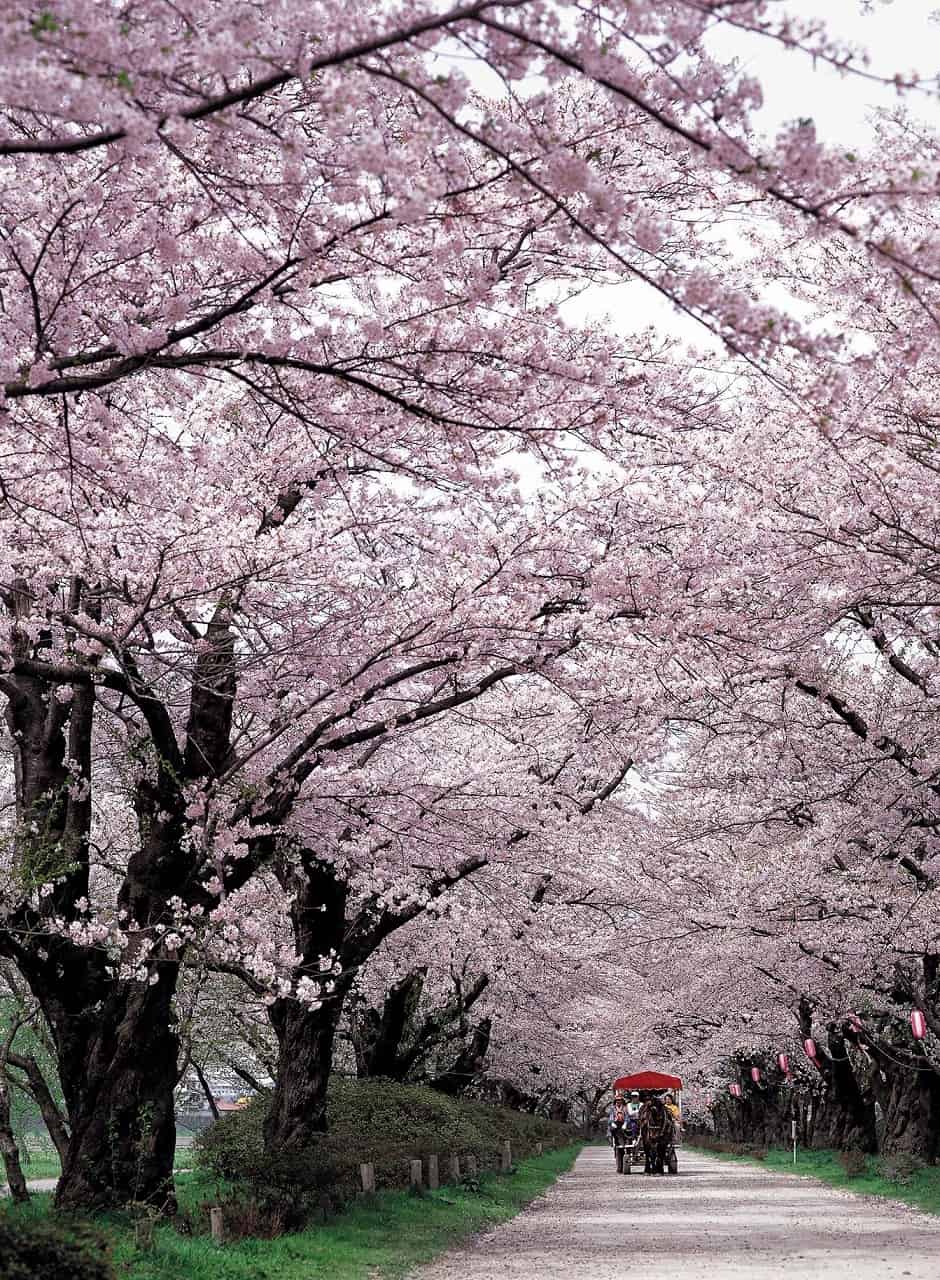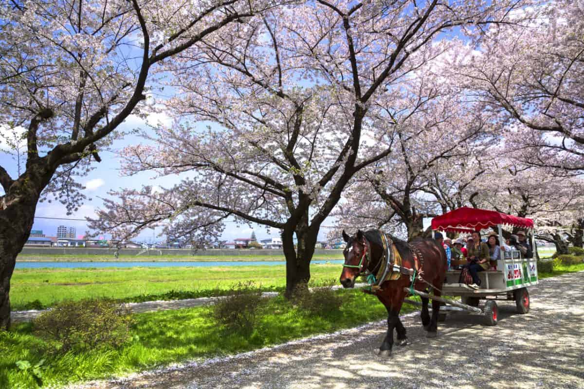 ในช่วงเทศกาลซากุระจะมีบริการรถม้าให้นั่งเพิ่มอรรถรสในการชมซากุระไปอีกระดับ และถ้าอยู่จนถึงหลังพระอาทิตย์ตกดินก็จะได้ชมไฟประดับอีกด้วย