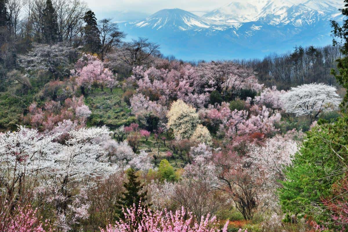 สวนฮานามิยามะ (Hanamiyama Park) เป็นอุทยานขนาดใหญ่ที่รวมดอกไม้สีสันต่างๆ ไม่ว่าจะเป็นดอกซากุระสีชมพูอ่อน ดอกบ๊วยสีชมพูเข้ม ดอกระฆังทองสีเหลือง ฯลฯ แซมด้วยต้นไม้สีเขียวหลากเฉดสี แถมด้วยภูเขาหิมะเป็นฉากหลัง ช่างเป็นสุดยอดทิวทัศน์ฤดูใบไม้ผลิที่สวยจนบรรยายเป็นคำพูดไม่ได้จริงๆ