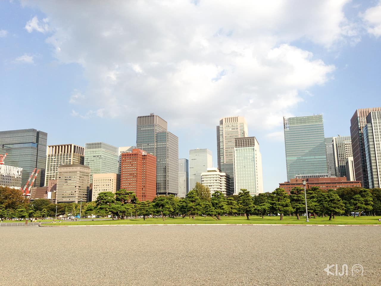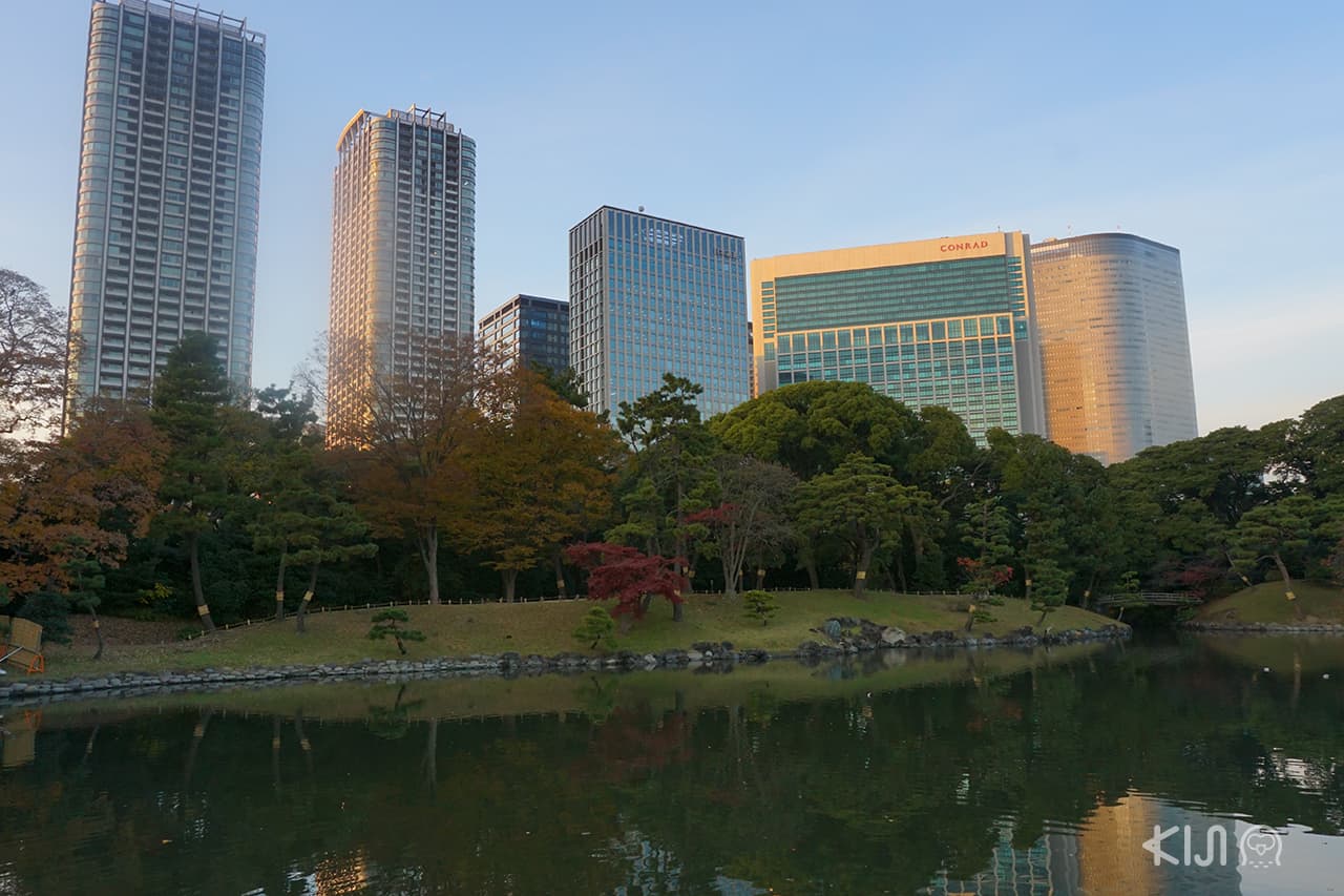 เมื่อมองจากสวน Hamarikyu ภาพที่เห็นจะเป็นตึกที่มีขนาดกว้างและดูใหญ่ ความสวยโมเดิร์นของตึกเป็นฉากหลังที่ตัดกันได้ดีเยี่ยมกับธรรมชาติต้นไม้ของสวน