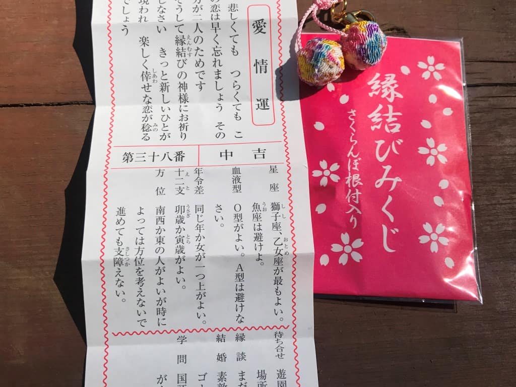 ขอพรเสร็จอย่าลืมแวะซื้อเครื่องราง Enmusubi no Ito หรือด้ายสำหรับผูกดวงชะตาระหว่างเรากับคนที่เรารัก ราคา 1,000 เยน ว่ากันว่าถ้าเอาด้ายนี้ไปผูกกับเสื้อผ้าหรือของติดตัวของเราแล้วล่ะก็ จะช่วยเสริมพลังบวกในด้านความสัมพันธ์กับคนรู้จักจนกลายเป็นคนรักได้ในที่สุด