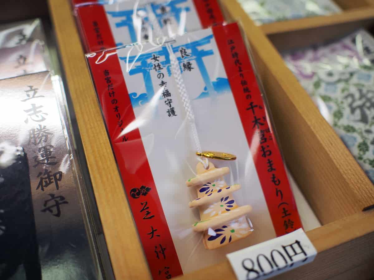 เครื่องรางจิงิบาโกะ (Chigibako) ราคา 800 เยน ทำจากดินเผาและแตกหักง่าย เป็นเครื่องรางชื่อดังของชิบะ ไดจินกูสำหรับผู้หญิงเท่านั้น ว่ากันว่าหากนำไปห้อยโทรศัพท์มือถือ กระเป๋าสตางค์ หรืออะไรก็ได้ที่ติดตัวได้เสมอในสภาพที่ยังสมบูรณ์อยู่ก็จะทำให้ความสัมพันธ์กับคนรอบๆ ตัวดีขึ้นอย่างต่อเนื่อง ถ้าซื้อไปแล้วก็ถนอมให้ดีล่ะ