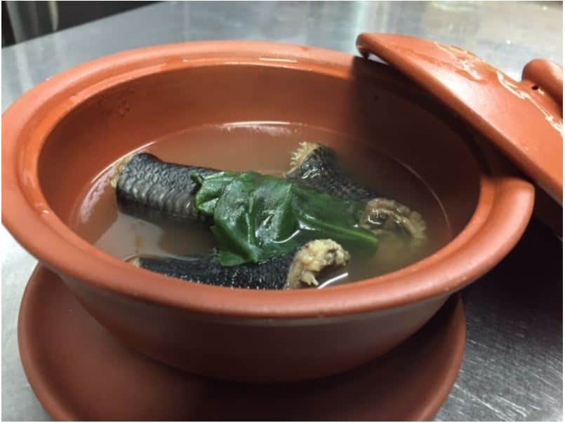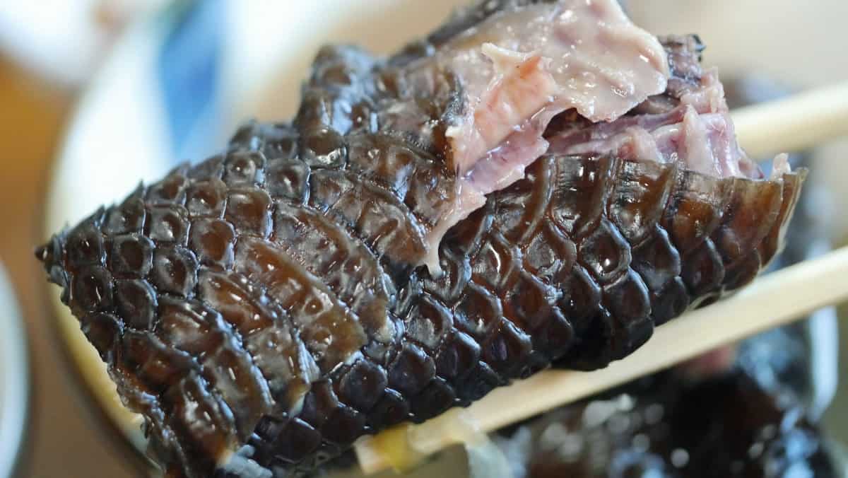 ยาคุเซ็นอิราบุเรียวริ (Yakuzen Irabu Ryori) ราคา 2,500 เยน ทำจากงูทะเลเอราบุ มีกลิ่นที่เป็นเอกลักษณ์ราวกับไม่เคยได้กลิ่นนี้มาก่อนในชีวิต เปิดประสบการณ์ในทิปโอกินาว่าได้ครบทุกมิติ
