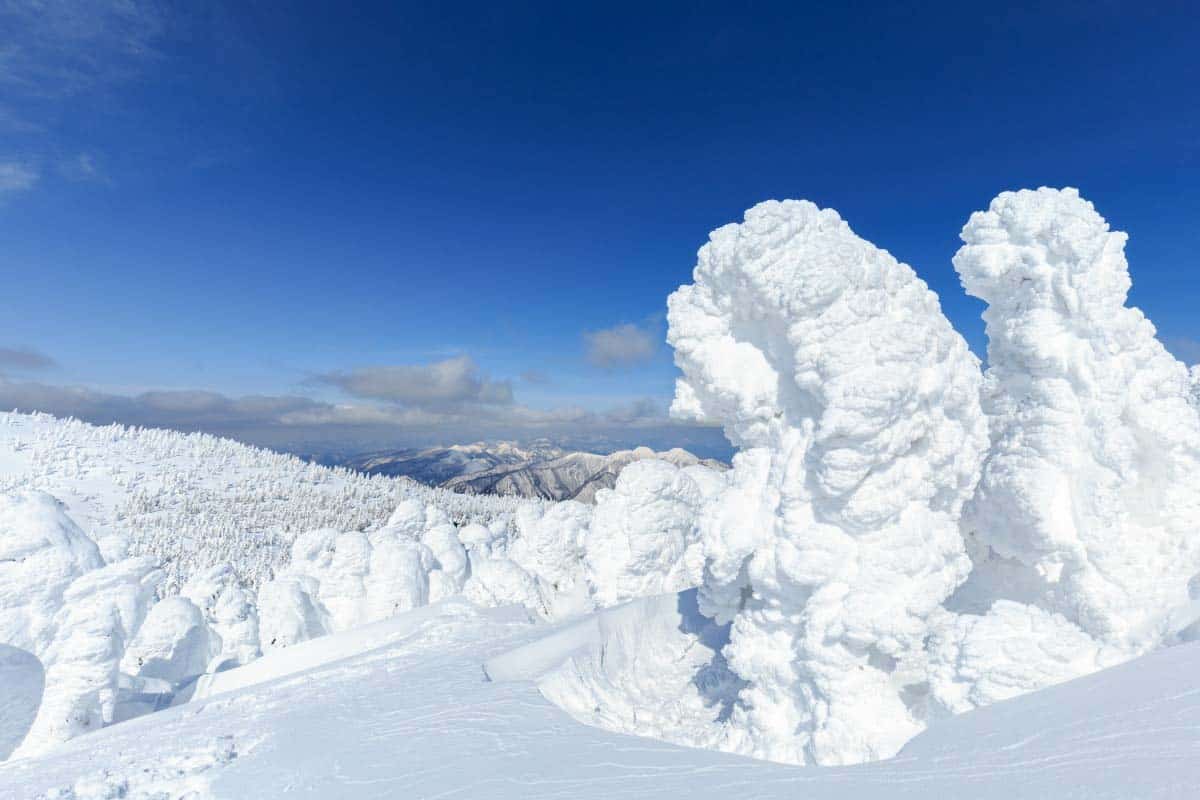 ปิดท้ายด้วย ภูเขาฮักโกดะ หนึ่งใน 100 ภูเขาที่มีชื่อเสียงที่สุดในญี่ปุ่น มีลักษณะเป็นกลุ่มภูเขาไฟสูงเสียดฟ้าหลายๆ ลูก ทางตอนใต้ของจังหวัดอาโอโมริ ใกล้เคียงมีจุดท่องเที่ยวมากมายอย่าง ทะเลสาบโทวาดะ (Lake Towada) แต่สำหรับหน้าหนาวแล้ว สิ่งที่ดึงดูดให้ผู้คนเดินทางมาชมภูเขาไฟที่กลายเป็นภูเขาหิมะแห่งนี้นั่นก็คือฝูงปีศาจหิมะตัวโตที่ปรากฏตัวออกมาเต็มไปหมด