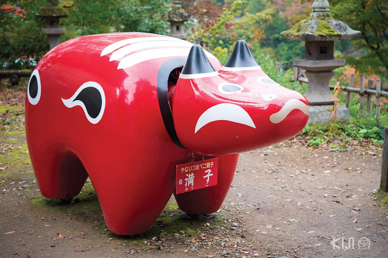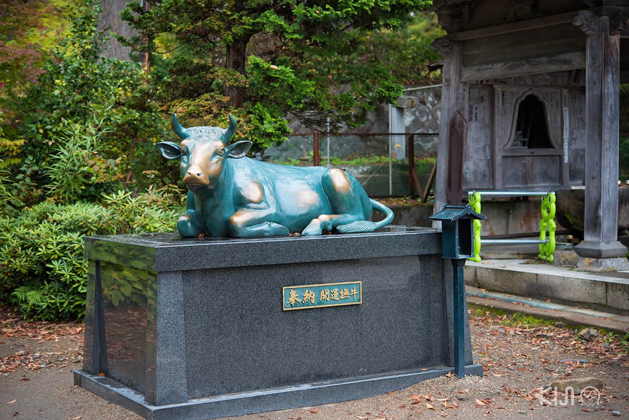 ที่นี่เป็นวัดนิกายรินไซอายุ 1,200 ปีชื่อดังประจำหมู่บ้านยาไนซุ ระหว่างที่ผมเดินเข้ามาในบริเวณวัด ผมก็สังเกตเห็นรูปปั้นวัวจำนวนมาก จนเกิดความสงสัยว่าทำไมวัดนี้รูปปั้นวัวเยอะจัง เอ๊ะ! หรือว่าจะเป็นวัดของคนที่เกิดปีฉลู พอผมเข้าไปภายในโบสถ์ของวัดก็แอบขนลุกจนต้องเก็บอาการและสำรวมนิดนึง เพราะว่าภายในโบสถ์มีพระพุทธรูปเก่าแก่ตั้งประดิษฐานอยู่ไว้ให้เราสักการะและขอพร ด้านในก็มีภาพวาดเสือเยอะมากๆ จนผมสงสัยอีกแล้วว่า เอ๊ะ! หรือจะเป็นวัดของคนเกิดปีขาล ผมสงสัยจนได้คำตอบว่าที่นี่คือวัดประจำปีฉลูและปีขาลจริงๆ ด้วย และวัดนี้ยังเป็นต้นกำเนิดเรื่องราวของเจ้าวัวเเดง อากาเบโกะ มาสคอตประจำไอสึอีกด้วย