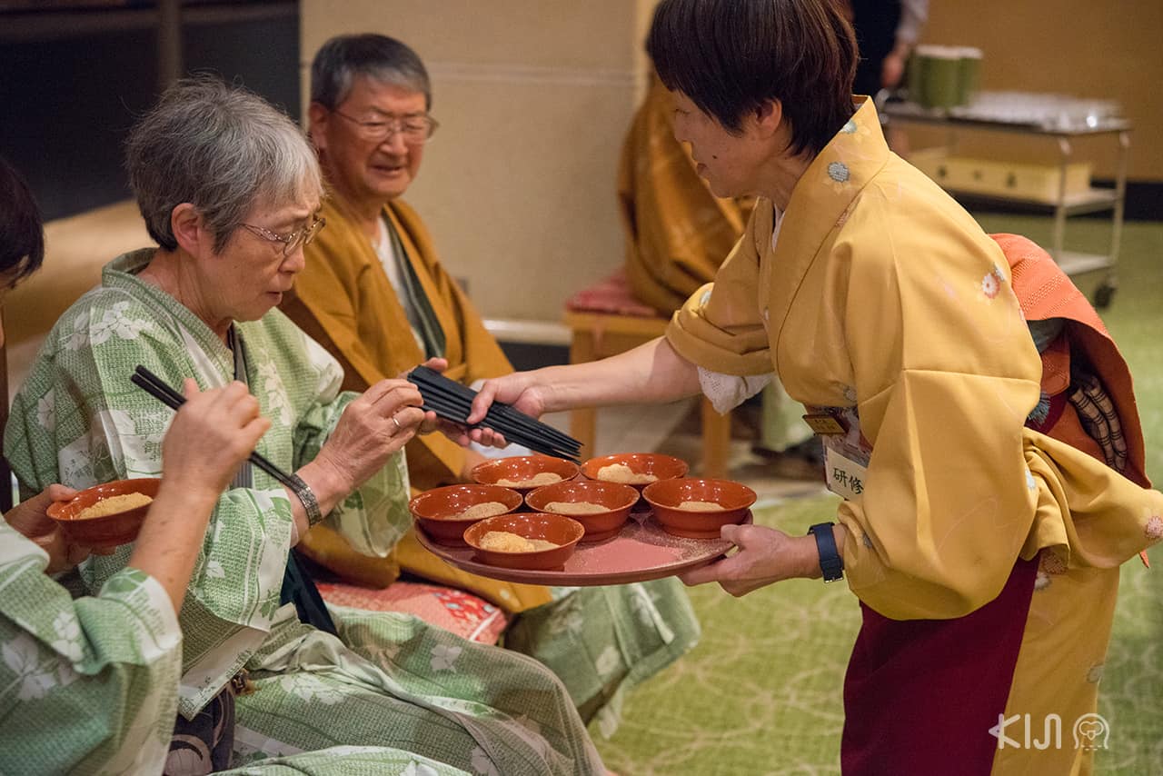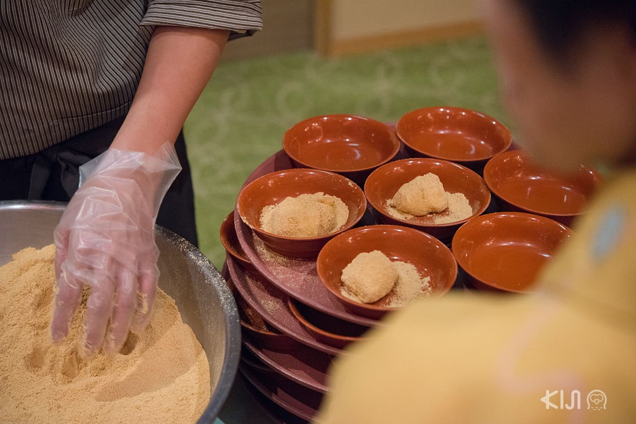 กิจกรรมต่อไปของทางโรงแรมนั่นก็คือการทำโมจิ ตอนเเรกผมก็แอบคิดนะครับว่าคงเป็นอารมณ์แบบสอนทำโมจิคลาสเล็กๆ ในห้องเรียน แต่เมื่อผมเดินไปยังห้องที่จัดกิจกรรมผมถึงกับต้องตกตะลึง เพราะสถานที่นั้นมันยิ่งใหญ่มากๆ นี่ยังนึกเลยว่าวันนี้จะมีงานบวชนาคใครหรือเปล่า เพราะสถานที่และการตกแต่งมันทำให้ผมรู้สึกว่าผมกำลังอยู่ในงานเทศกาลอย่างแท้จริง ไม่นานนักกิจกรรมการทำโมจิก็ได้เริ่มขึ้น ผมเห็นทุกคนช่วยกันตำแป้งโมจิที่อยู่ในครกยักษ์กันอย่างสนุกสนาน พร้อมตะโกนอย่างสุดเสียงเข้ากับจังหวะการตำแป้งโมจิว่า “อะโซเละ โซเละ โซเละ โยอิโชะ” เดาว่าความหมายก็คงจะคล้ายๆ บ้านเราประมาณว่ารวมพลังกัน เอาฮุยเลฮุย! แน่นอนว่าผมได้ลองทานโมจิที่ทำเสร็จใหม่ๆ รสชาติหวานพอดีๆ เนื้อแป้งโมจิก็นุ่มละมุนลิ้นมากๆ