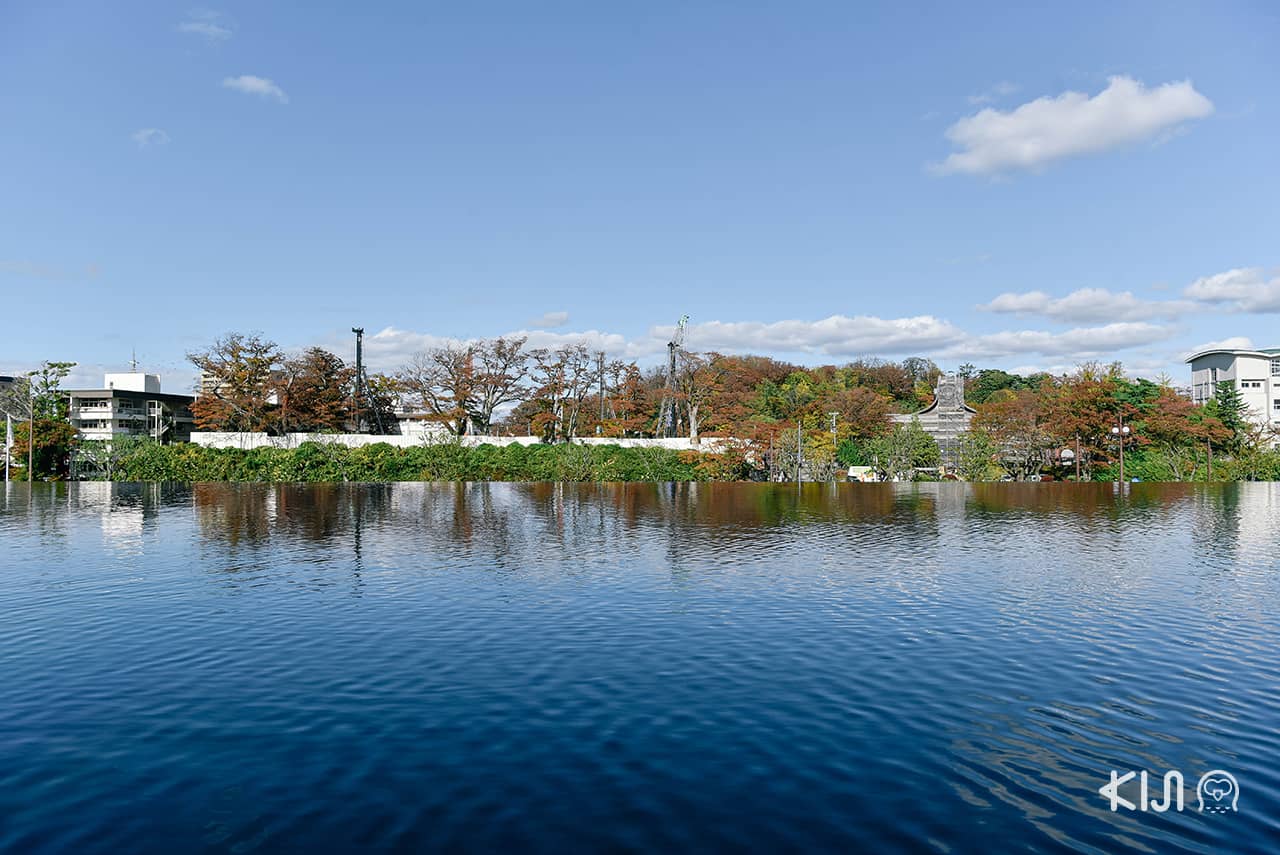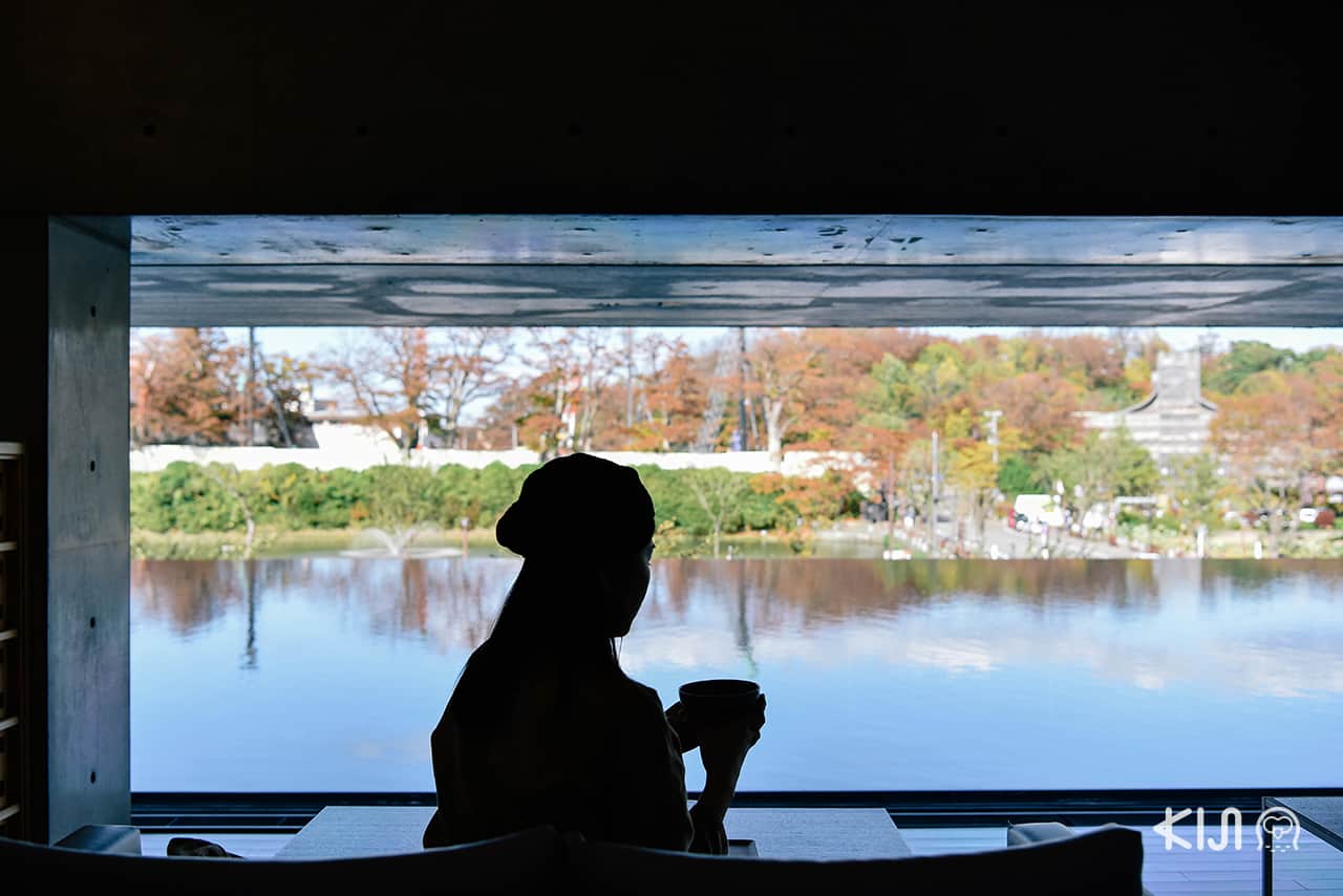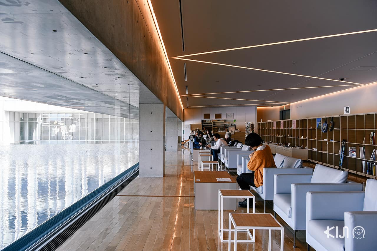 ภายในผสมผสานงานศิลปะเอาไว้ทั้งแบบชั่วคราวและถาวรตลอดทั้งปี ที่ชั้น 2 มี Tsuguharu Foujita Gallery คอลเลคชั่นถาวรของซึกุฮารุ ฟุจิตะ และมีโซนห้องสมุด ร้านขายของที่ระลึก และคาเฟ่บรรยากาศดีเสิร์ฟเมนูที่ใช้วัตถุดิบท้องถิ่นเป็นหลัก ความเก๋คือทุกโต๊ะจะหันหน้าออกด้านนอก เผยให้เห็นอาคารคอนกรีตปกคลุมด้วยผิวน้ำผ่านกระจกใส ให้ความรู้สึกเหมือนได้นั่งจิบชาอยู่ริมน้ำนิ่งๆ แต่กลับทำให้ใจสงบอย่างบอกไม่ถูก เป็นการออกแบบที่เราประทับใจมาก