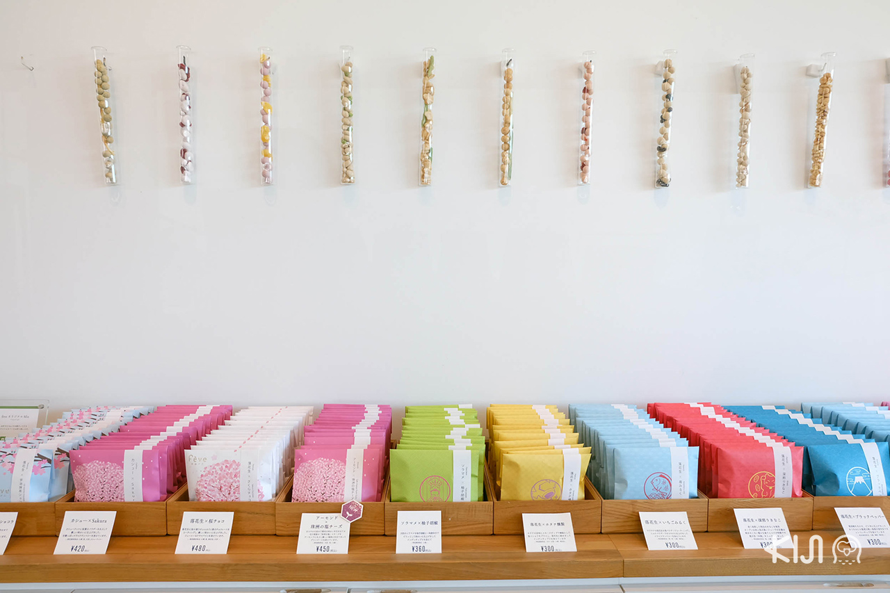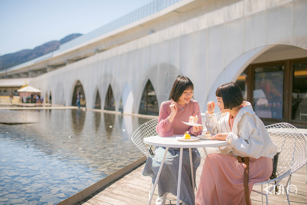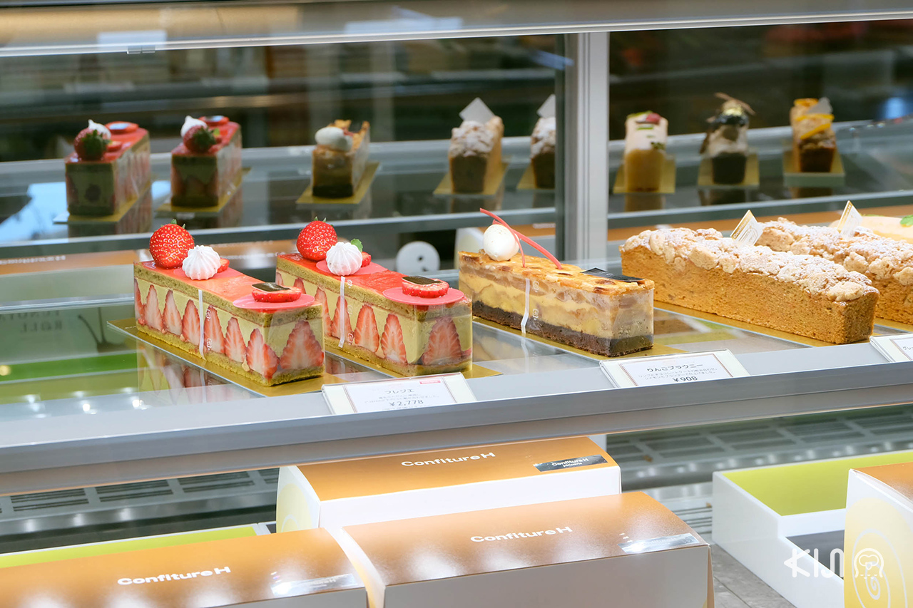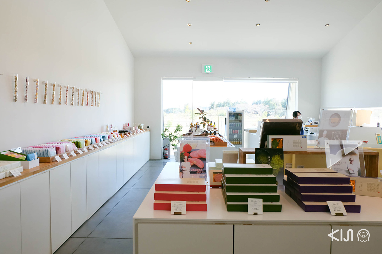 ไฮไลท์ที่สองตกเป็นของคาเฟ่ขนมหวานในอาคารชื่อ Confiture H เมื่อเดินเข้ามาด้านในจะพบกับตู้ขนมหวานหน้าตาดูดีมีความน่าอร่อยเรียงรายอยู่เต็มไปหมดทั้งเค้ก มาการอง ทาร์ต มองบลัง ฯลฯ รวมไปถึงแยมนานาชนิดที่ใช้น้ำผึ้งแทนน้ำตาล และถ้าเห็นขนมที่มีสตรอว์เบอร์รีเป็นส่วนผสม มั่นใจได้เลยว่าเป็นผลิตผลจากสวนที่เราเพิ่งแวะไปสักครู่ นอกจากนี้ร้านขนมปังที่นี่ก็ปังสมชื่อ มีถ้วยรางวัลจากหลายการแข่งขันในระดับนานาชาติรับประกันความอร่อย