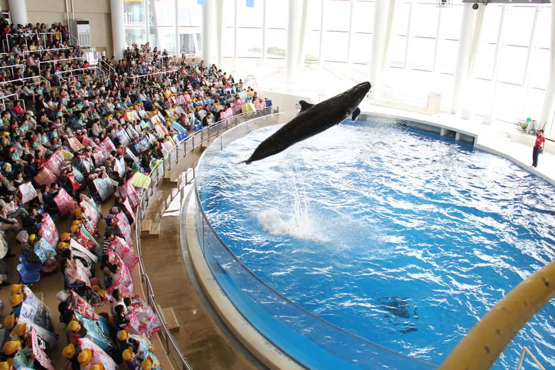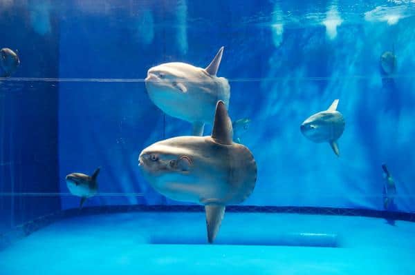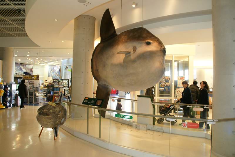 พระเอกของเรา “ฉลาม” ที่มีจำนวนมากที่สุดในญี่ปุ่นแหวกว่ายอยู่ในตู้ปลาที่ใหญ่ที่สุดในญี่ปุ่น แต่ก็โดนแย่งซีนจากปลาโมลาโมลาที่รูปร่างหน้าตาตลก ว่ายเชื่องช้าพลางทำหน้ามึนตลอดเวลา นอกจากนี้ยังหาดูปลาและปะการังที่มาจากทะเลโอกินาว่าและมหาสมุทรอินเดียได้อีกด้วย สามารถชมการให้อาหารฉลามได้ในเวลา 10.20 น. (ประมาณ 10 นาที) หรือชมการให้อาหารปลาโมลาโมลาได้ในเวลา 11.00 น.หรือ 15.20 น. (ประมาณ 5 นาที)