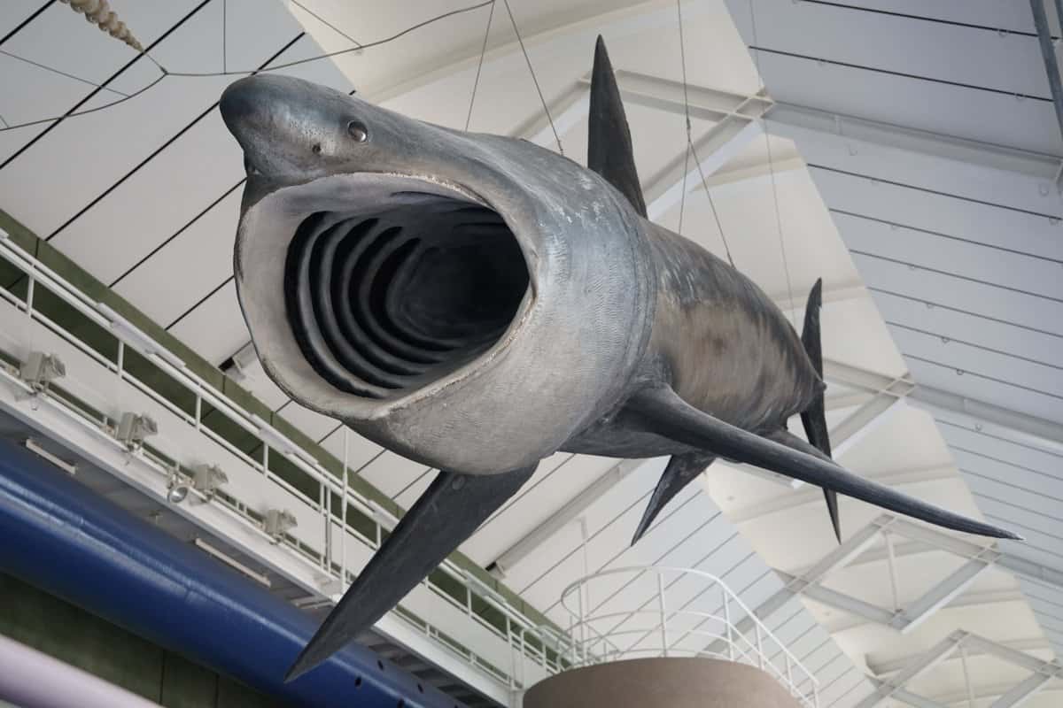 นอกจากตู้ปลาพรรณไม้น้ำขนาดใหญ่แล้ว เหนือศีรษะยังมีซากโครงกระดูกวาฬสเปิร์ม วาฬแปซิฟิกเหนือ รวมถึงปลาฉลามอาบแดด (Basking Shark) สตัฟฟ์ตัวใหญ่ที่สุดในโลกให้ได้ตื่นตาตื่นใจกัน