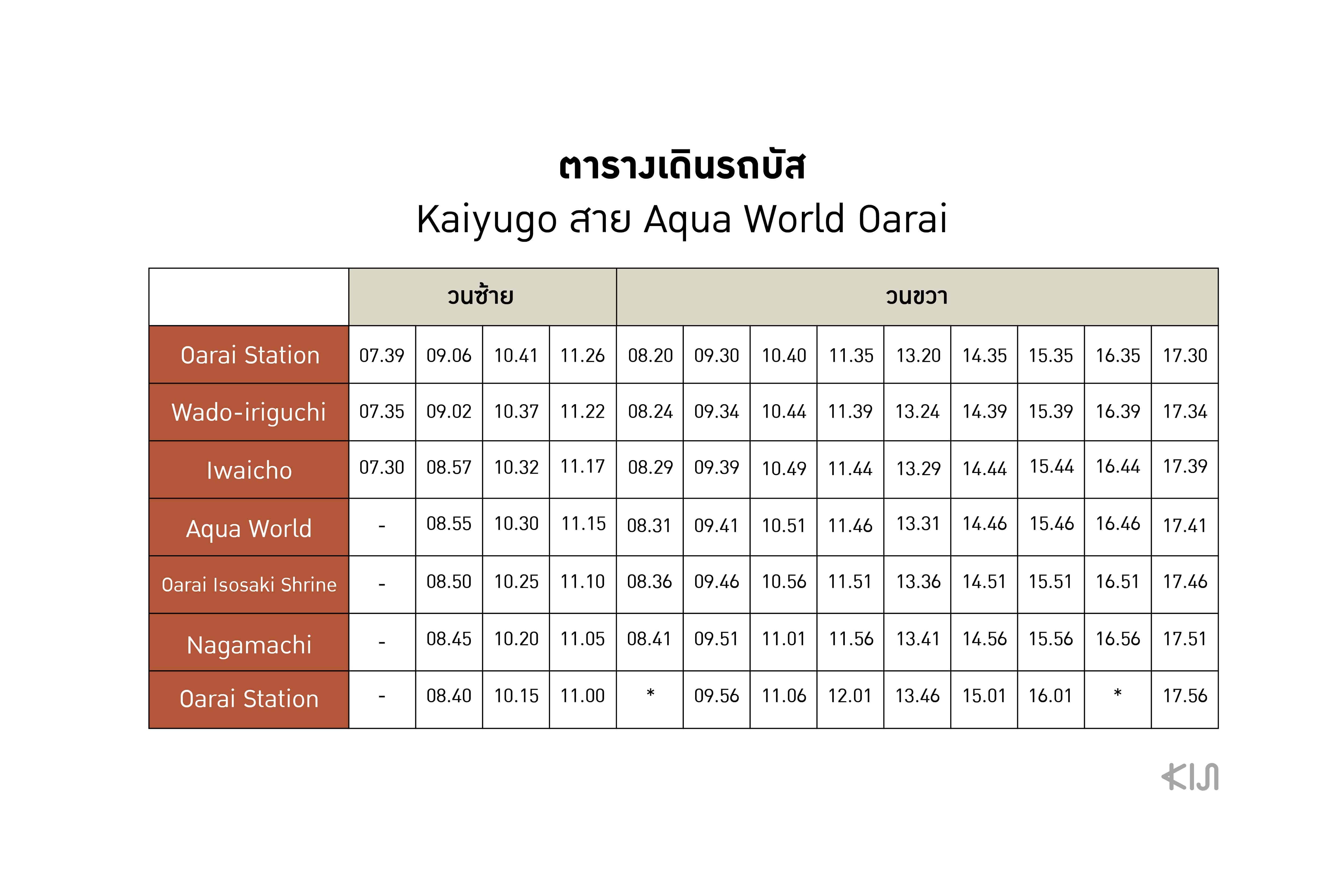 เมื่อถึงสถานี Oarai ให้เดินไปที่ป้ายรถเมล์ ขึ้นรถบัส Kaiyugo ที่ไปเส้นทาง Aqua World-Oarai (ระวังอย่าขึ้นผิดเป็นสาย Oarai Sun Beach) ผู้ใหญ่ราคา 100 เยน เด็ก 50 เยน ใช้เวลาประมาณ 15 นาที