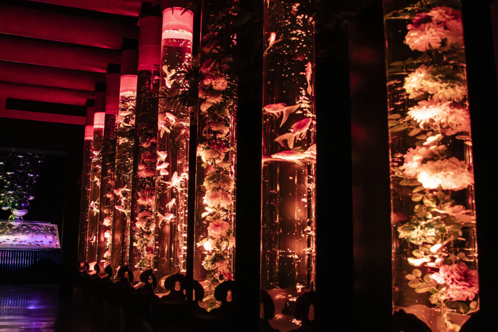 นอกจากนี้ อีกหนึ่งความร่วมมือที่ไม่พูดถึงไม่ได้คือการจัดดอกไม้โดยศิลปินอิเคบานะชื่อดัง Shogo Kariyazaki ผู้ที่แต่งแต้มสีสันของดอกไม้ออกมาได้อย่างงดงามละลานตา ดอกไม้ที่จัดวางอย่างพลิ้วไหวอยู่เหนือแนวตู้ปลา ช่วยเติมชีวิตชีวาให้พื้นที่ทั้งหมด ราวกับเราได้หลุดเข้าไปอยู่กลางทุ่งดอกไม้ที่ลอยอยู่ในโลกใต้น้ำเลยทีเดียว