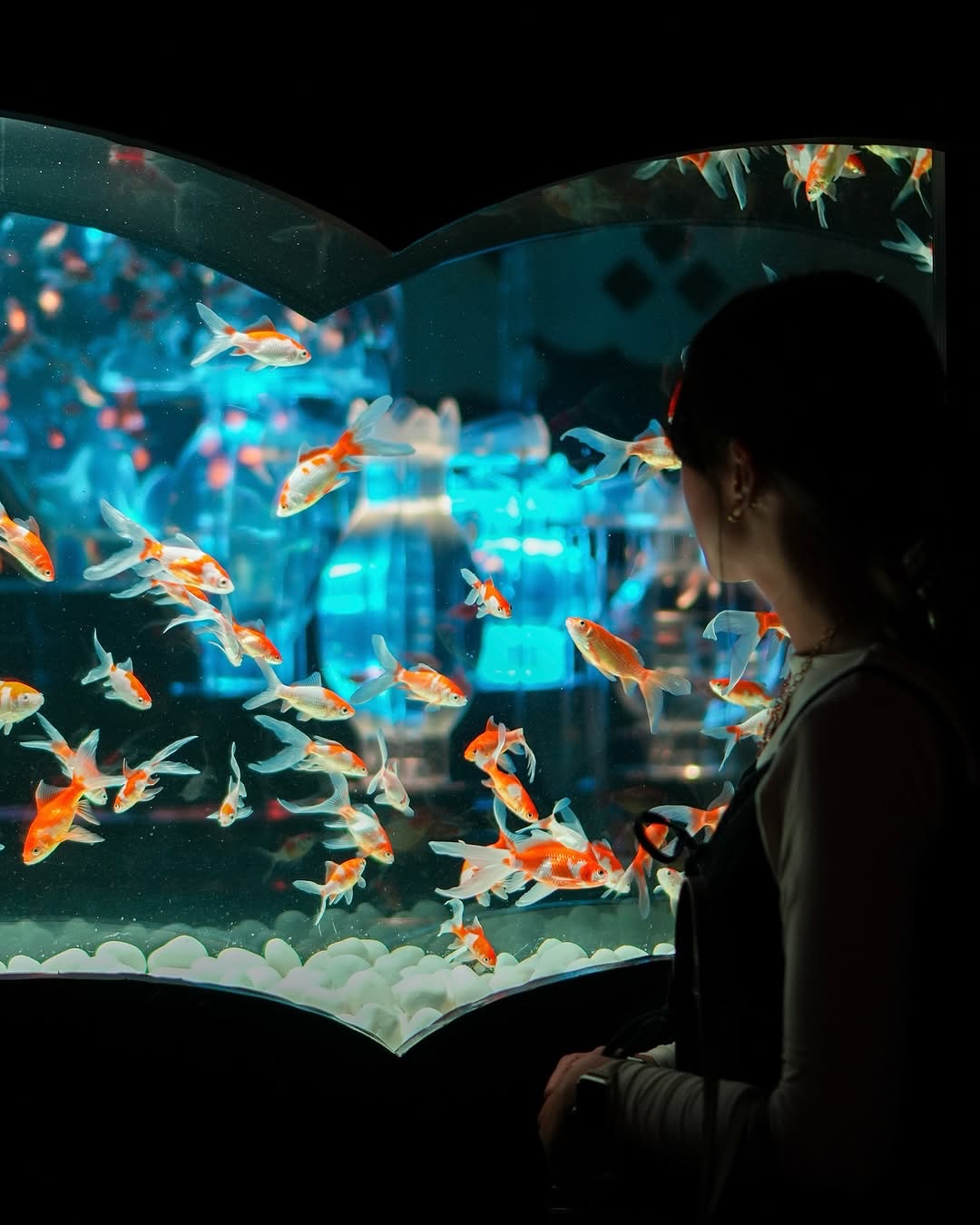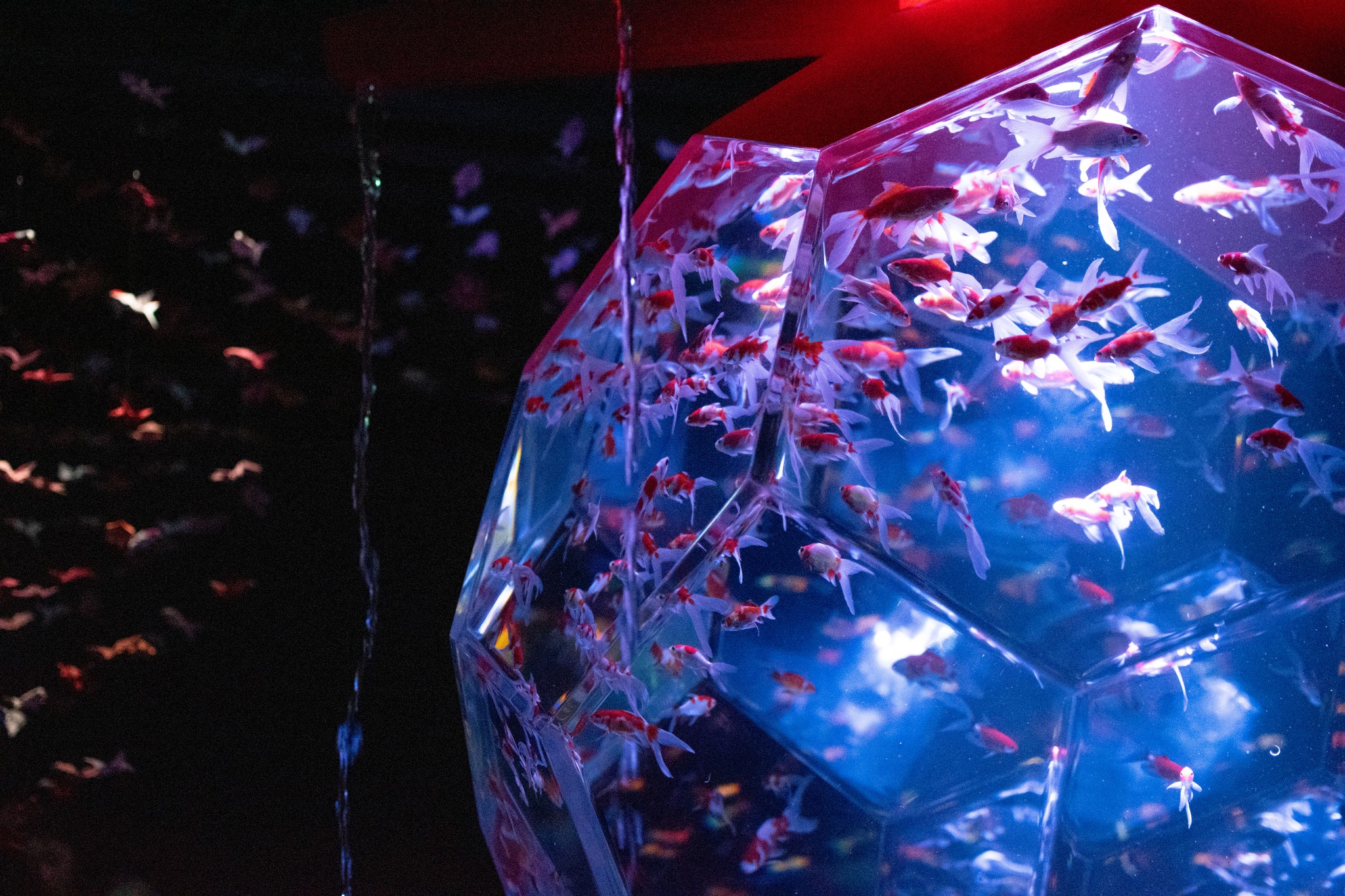 สิ่งที่ทำให้ที่นี่โดดเด่นไม่เหมือนที่ไหน คือคอนเซปต์ “ปลาทอง × ศิลปะ” ในโลกที่เราจะได้เห็นปลาทองแหวกว่ายอย่างสวยงามมากถึง 5,000 ตัว กว่า 70 สายพันธ์ุท่ามกลางพื้นที่ที่อาบไปด้วยแสงระยิบระยับ ดนตรี และกลิ่นหอมละมุน ซึ่งแนวคิดทั้งหมดเริ่มต้นจากการหยิบวัฒนธรรมการชมปลาทองที่สืบทอดมาตั้งแต่สมัยเอโดะ มาตีความใหม่ในรูปแบบงานศิลปะร่วมสมัย จนกลายเป็น Art Aquarium พื้นที่พิเศษที่ผสานความงามของตู้ปลา การจัดวางพื้นที่ และการกระตุ้นประสาทสัมผัสทั้งห้าเข้ากับเสน่ห์หลากหลายรูปแบบของปลาทองได้อย่างลงตัว และยังได้รับการยกย่องว่าเป็นพิพิธภัณฑ์จัดแสดงศิลปะปลาทองที่ใหญ่ที่สุดในญี่ปุ่นอีกด้วย