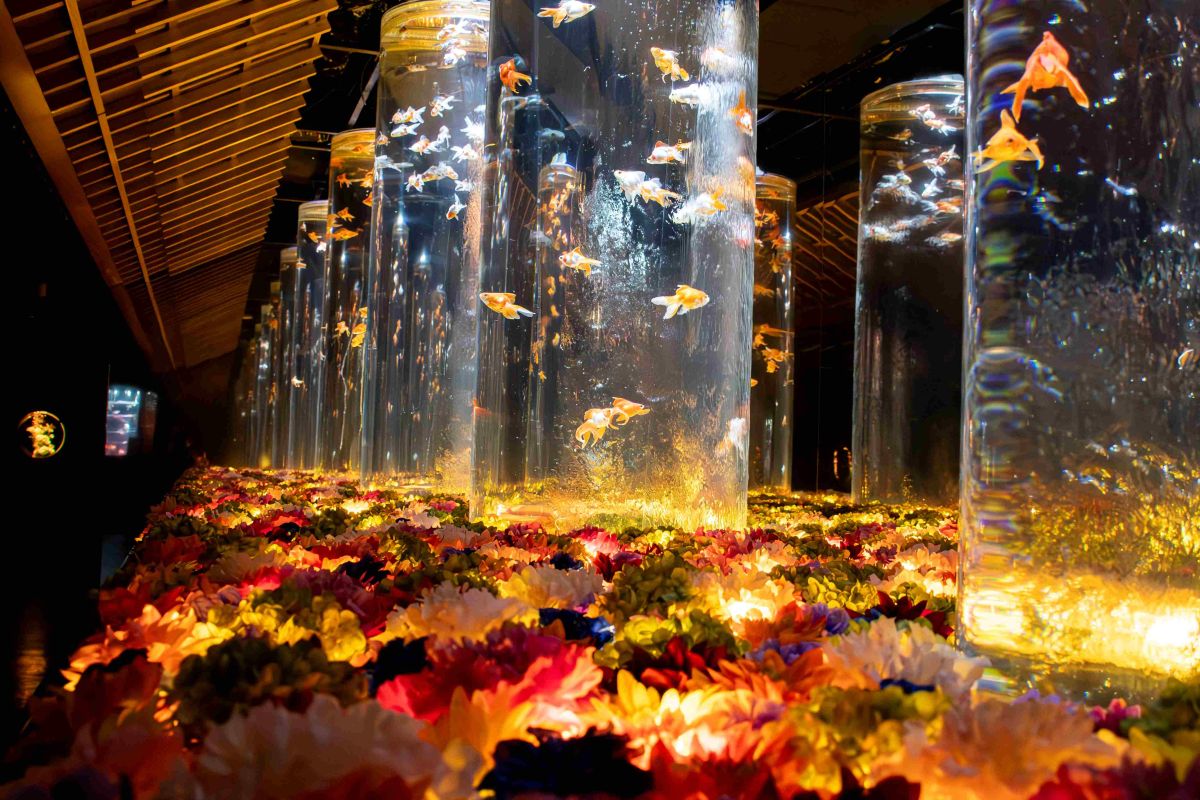 จากโถงทางเดินปลาทอง (Goldfish Corridor) คุณ Hibiya Kadan ได้สร้างสรรค์ผลงานชื่อว่า “Ephemeral Bloom” ด้วยการหยิบสีสันของดอกไม้และการจัดวางดอกไม้ขนาดใหญ่ มาจัดเรียงให้แน่นเต็มพื้นที่ โอบล้อมตู้ปลาทองเอาไว้จนแทบไม่เหลือช่องว่าง ช่วยขับความงดงามของปลาทองให้โดดเด่นยิ่งขึ้น และทำให้บรรยากาศดูละมุน
