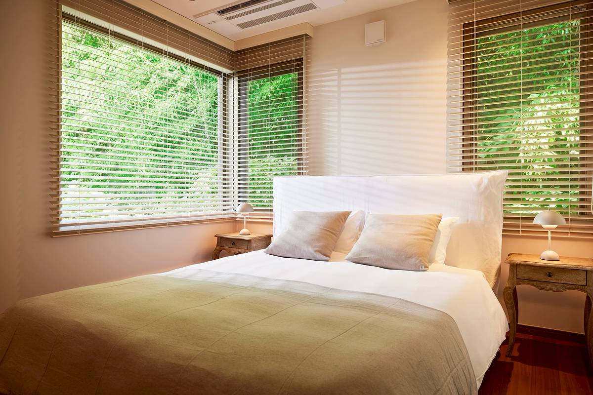 บริเวณรอบนอกวิลล่าร่มรื่นไปด้วยพืชพรรณนานาชนิดดูเงียบสงบ มีห้องนอนทั้งหมด 5 ห้อง เข้าพักมากสูงสุด 15 คน โดยจะมีทั้งห้องนอนที่เป็นสไตล์ตะวันตกและห้องนอนที่เป็นสไตล์ญี่ปุ่น ห้องนอนแบบญี่ปุ่นจะปูที่นอนเตรียมไว้ให้ ซึ่งเป็นห้องที่อยู่ติดกับห้องนั่งเล่น