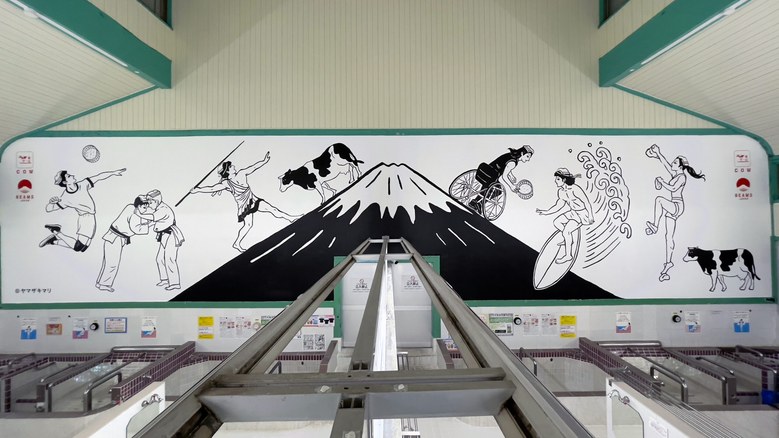 ปีนี้ Kotobukiyu เซนโตท้องถิ่นในย่านฮิกาชิ อุเอโนะ (Higashi-Ueno) ได้เปลี่ยนโฉมใหม่ตั้งแต่ Noren ผ้าม่านญี่ปุ่นแบบดั้งเดิมบริเวณทางเข้า ส่วนไฮไลท์หลักอยู่ที่ภาพวาดร่วมสมัยบนฝาผนัง ในคอนเซ็ปต์กีฬาโอลิมปิกญี่ปุ่นที่ออกแบบโดยยามาซากิ มาริ ภาพประกอบขาวดำที่ผสมผสานระหว่างภูเขาไฟฟูจิอันเป็นสัญลักษณ์ของประเทศญี่ปุ่นกับกีฬา 6 ประเภท ได้แก่ วอลเลย์บอล พุ่งแหลน ยูโด โต้คลื่น ปีนเขา และกีฬาวีลแชร์