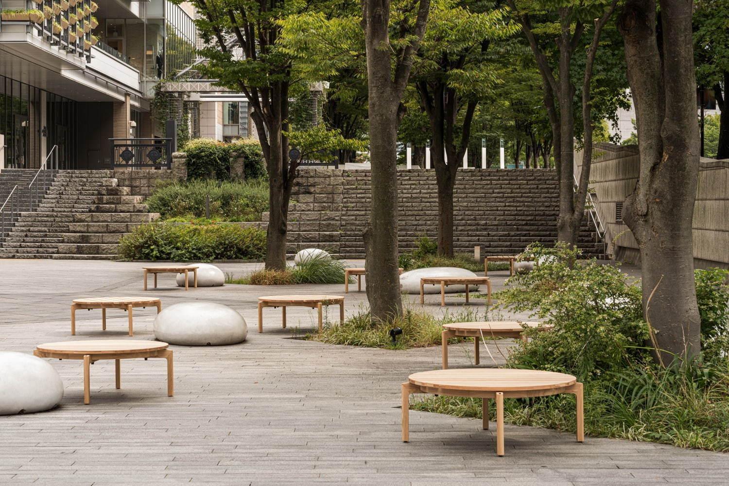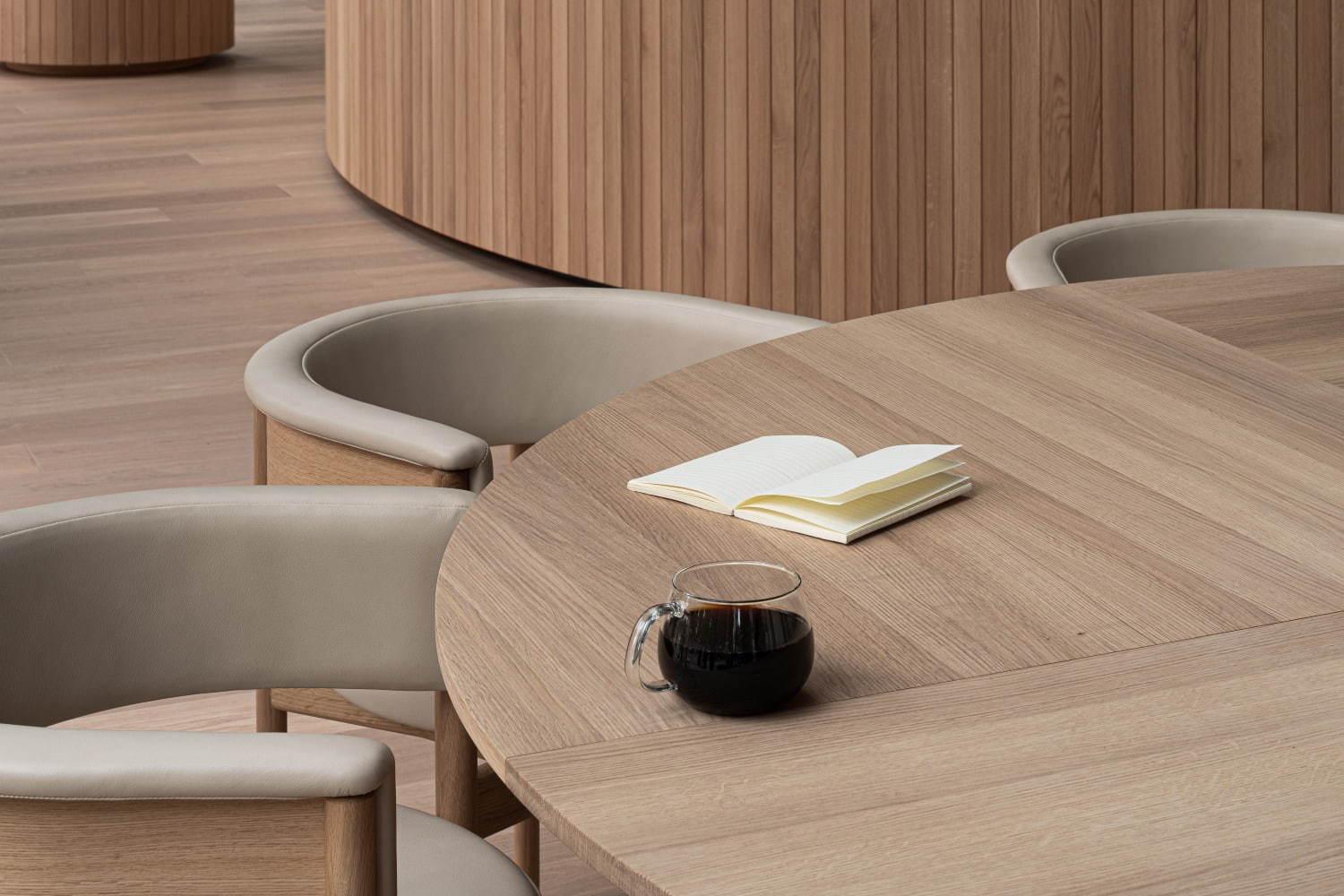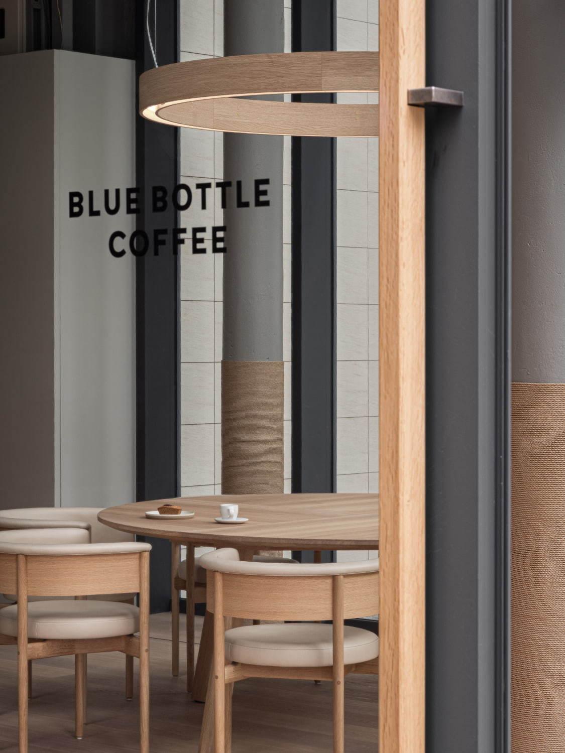 เคาน์เตอร์และเก้าอี้ไม้ที่ใช้ในคาเฟ่นั้นออกแบบโดยคุณอาชิซาวะ เคจิ (Keiji Ashizawa) สถาปนิกชาวญี่ปุ่นที่มาร่วมงานกับ Blue Bottle Coffee เป็นครั้งแรก จับมือกับ Norm Architects สตูดิโอออกแบบจากเมืองโคเปนเฮเกน ประเทศเดนมาร์ก ผลิตโดย Karimoku บริษัทผลิตเฟอร์นิเจอร์ไม้ชั้นนำของญี่ปุ่น ซึ่งลูกค้าที่สนใจเฟอร์นิเจอร์สามารถสั่งซื้อที่ร้านได้เลย เช่น เก้าอี้คาเฟ่ราคาตัวละ 63,700 เยน (รวมภาษี) ซึ่งสินค้าทั้งหมดนี้อยู่ในซีรีส์สินค้าที่ชื่อว่า Karimoku Case Study FOR Blue Bottle Coffee