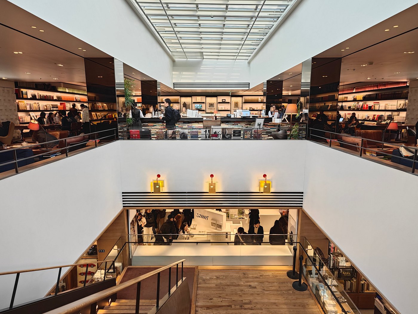 ข้างในเขาออกแบบมาให้เหมือน “ห้องสมุดกลางป่า” แบ่งเป็น 3 ตึกเชื่อมกัน มีทางเดินยาว ๆ ตรงกลางที่แยกออกไปตามโซนหนังสือต่าง ๆ ที่นี่ขึ้นชื่อเรื่องหนังสือเยอะและหลากหลายมาก มีตั้งแต่นิตยสาร หนังสือแฟชั่น งานดีไซน์ ไปจนถึงพวกหนังสือเก่าหายากจากทั่วโลกที่สายอาร์ตต้องเลิฟแน่นอน