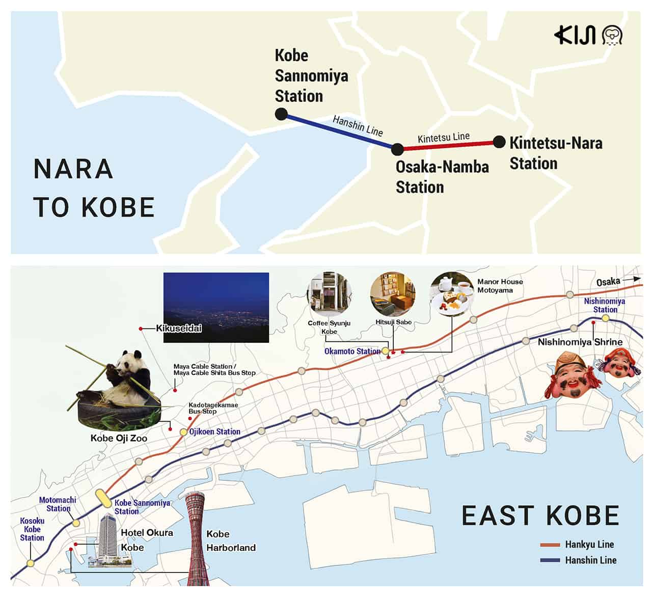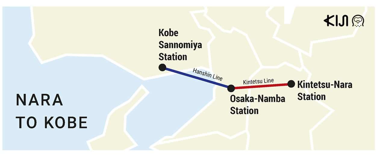 - จากนาราให้ใช้บริการรถไฟสาย Kintetsu-Nara Line ไปลงที่Osaka-Namba Station จากนั้นให้เดินไปขึ้นสาย Hanshin Line ไปลงที่ Sannomiya Station จากสถานีมี Shuttle Bus รับส่งถึงโรงแรม (อยู่ตรงชานชาลารถบัสชั้น 1 ของอาคาร Mint Kobe)