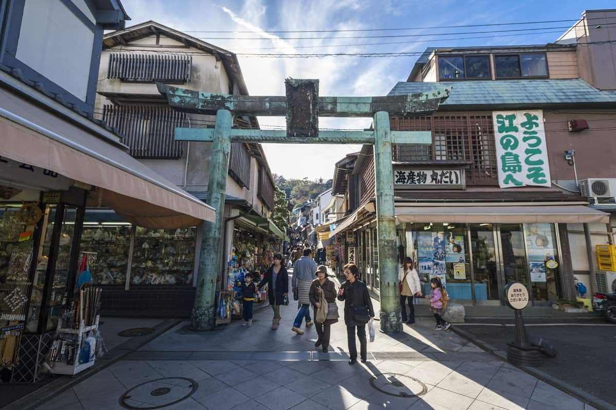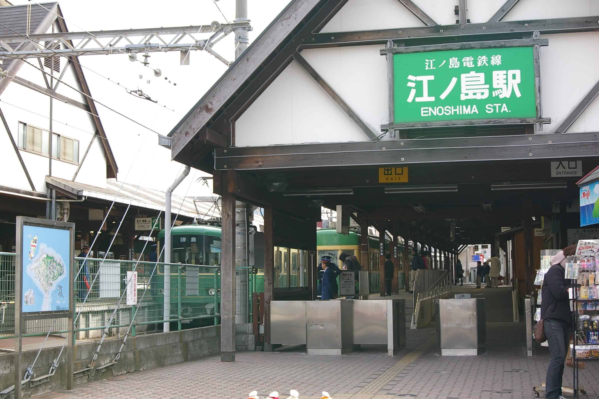 เมื่อเข้าสถานีคามาคุระ (Kamakura) ให้ไปที่ชานชาลาหมายเลข 1 จากนั้นขึ้นรถไฟไปลงสถานีเอโนชิมะ (Enoshima) ใช้เวลาประมาณ 24 นาที เมื่อถึงแล้วเดินจากสถานีไปที่เกาะเอโนชิมะใช้เวลาประมาณ 12 นาที ระหว่างทางจะมีจุดช็อปปิ้ง คาเฟ่และร้านค้าน่ารักๆ สไตล์ริมทะเลให้หยุดพักได้เรื่อยๆ แต่ไม่แนะนำให้ใช้เวลาแถวนั้นนาน เพราะจะเสียโอกาสที่จะได้อยู่บนเกาะเอโนชิมะนานๆ รวมถึงถ้าช็อปปิ้งไปก่อนแล้ว ของก็จะพะรุงพะรังเป็นภาระต่อการเดินขึ้นเขาบนเอโนชิมะ
