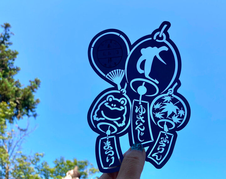 แน่นอนว่ามาถึงนี่แล้วจะไม่มีของที่ระลึกติดไม้ติดมือกลับบ้านก็คงไม่ได้ เราขอแนะนำสิ่งนี้เลย กระดาษฉลุลายโกชูอิน (Kirie Goshuin) สุดลิมิเต็ด กระดาษที่เราเห็นอยู่นี้ไม่ใช่กระดาษธรรมดานะ เพราะมันคือกระดาษที่ฉลุลายโกชูอิน (ตราประทับประจำแต่ละวัด) นั่นเอง ซึ่งมีขายในช่วงเทศกาลกระดิ่งลมเท่านั้น ดีเทลสวยขนาดนี้จะห้ามใจไม่ให้ซื้อมาเก็บสะสมยังไงไหว