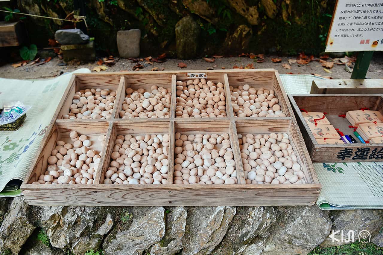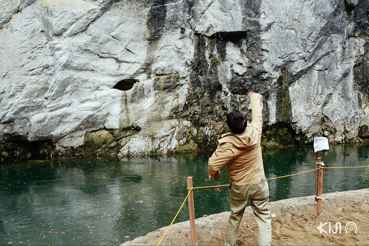 เรือค่อยๆ แล่นตามน้ำไปเรื่อยๆ จนถึงจุดกลับเรือ ตรงนี้เขาจะปล่อยให้เราลงเดินเล่นประมาณ 20 นาที จำหน้าคนพายเรือและเพื่อนร่วมทางไว้ให้ดีล่ะ พลัดหลงกันแล้วแย่เลย เดินเข้าไปจนถึงจุดด้านในสุดของหุบเขาจะมีช่องหินอธิษฐานบริเวณหน้าผาสูง 124 เมตร เชื่อกันว่าถ้าขว้างหินผ่านเข้าไปในช่องได้ คำอธิษฐานของเราจะเป็นจริง ส่วนหินที่ใช้โยนต้องเป็นหินเสี่ยงทายเท่านั้น มี 10 ชนิด คือ โชคชะตา อายุขัย ความสุข เนื้อคู่ ขอพร ความรักชายหญิง ความรัก ความผูกพัน โชคดี ทรัพย์สมบัติ ซึ่งมีจำหน่ายบริเวณใกล้ๆ ในราคา 5 ก้อน 100 เยน