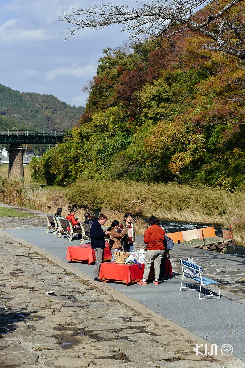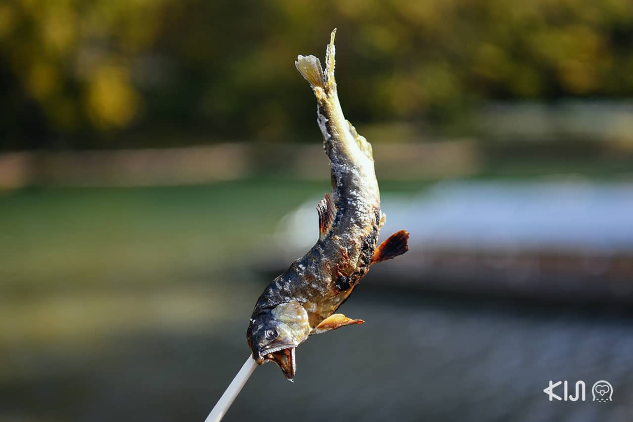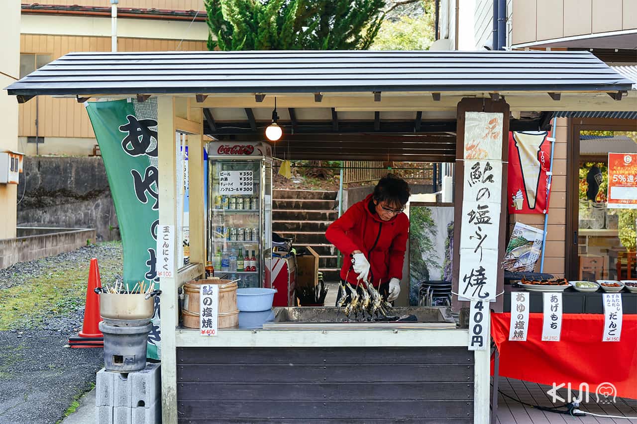 ปิดท้ายการล่องเรือด้วยปลาอายุเสียบไม้ย่างถ่าน ซึ่งเป็นอาหารขึ้นชื่อของหุบเขาเกบิเค (Geibikei Gorge) มีร้านปลาอายุย่างจำหน่ายทั้งแบบเสียบไม้กินเปล่าๆ ตั้งอยู่ด้านหน้าร้านขายของฝาก เนื้อปลาสีขาวนวลกับรสชาติเค็มกำลังดี เป็นรสชาติที่ถูกปากเราจริงๆ แต่ถ้าร่างกายต้องการคาร์โบไฮเดรตก็แนะนำให้เดินขึ้นไปบนชั้น 2 จะเป็นร้านอาหารที่มีเซ็ตข้าวกับปลาอายุย่าง หรือเมนูกินง่ายอื่นๆ เช่น ข้าวห่อไข่ ข้าวหน้าเนื้อ ราเมน ฯลฯ คอยให้บริการ