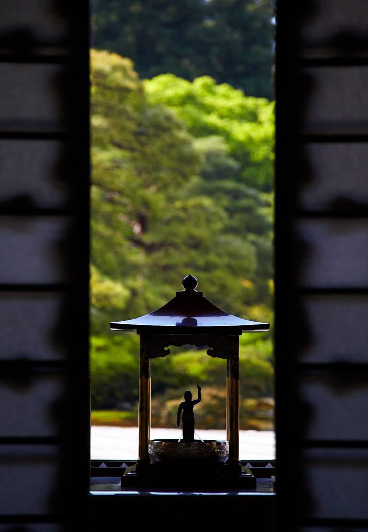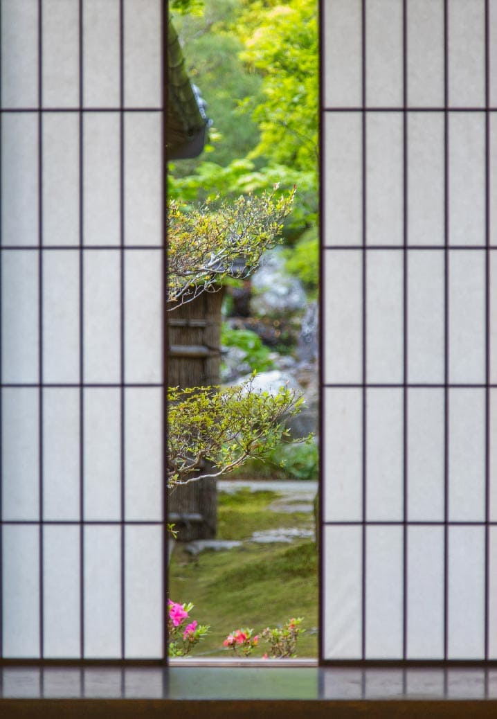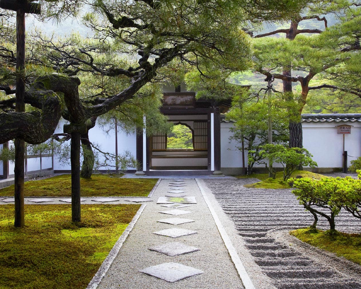 กินคะคุจิต่างจากคินคะคุจิในแง่การออกแบบสวน การจัดลำดับในการเข้าชมวัดอย่างมาก วัดนี้เป็นวัดในนิกายเซน แน่นอนว่าส่วนที่เด่นของภูมิทัศน์วัดเซนคือสวนแห้ง แต่การเข้าชมสวนแห้งที่นี่มีความโดดเด่นกว่าวัดอื่นในเกียวโตคือลำดับการเข้าถึงส่วนต่างๆ ในสายตาของผมที่เป็นสถาปนิก มันมีลำดับการเข้าชมแต่ละส่วนอย่างมีชั้นเชิง เมื่อเข้ามาถึงหน้าวัดจวบจนผ่านซุ้มขายตั๋ว จะพบกับซุ้มไม้พุ่มสูงราวกับบ้าน 2 ชั้น มันทำหน้าที่อำพรางเรื่องราวด้านหลังให้ชวนสงสัยว่าภายในวัดจะเป็นเช่นไร การคาดเดาไม่ได้ ความรู้สึกแปลกใจมีเสน่ห์เสมอในการเดินทาง