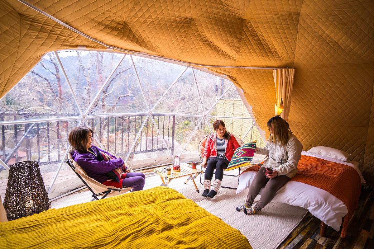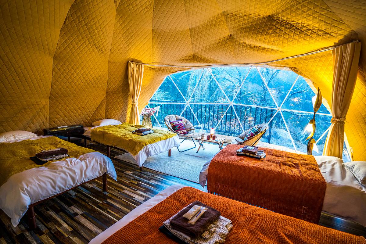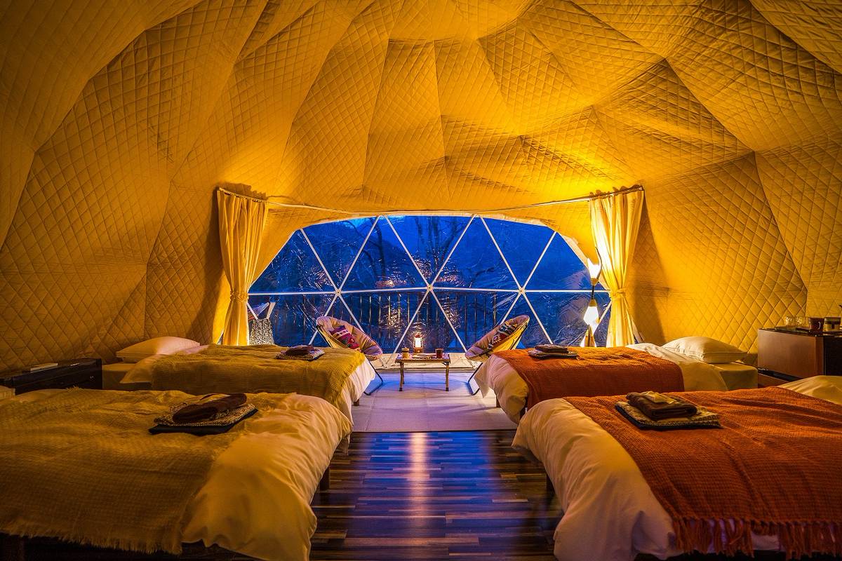 ภายในเต็นท์โดมก็กว้างขวางเพราะมีขนาดเส้นผ่าศูนย์กลางถึง 6 เมตร สามารถเข้าพักได้สูงสุดถึง 4 คน และเป็นเต็นท์โดมชนิดเดียวกันกับที่ใช้ในรีสอร์ทที่ตั้งอยู่บริเวณเทือกเขาแอลป์และในทะเลทราย ดังนั้นไม่ว่าจะเป็นอากาศร้อนหรืออากาศหนาว เต็นท์ที่นี่ก็เอาอยู่ ไม่มีปัญหา นอกจากนี้ภายในห้องพักยังมีเครื่องปรับอากาศติดตั้งไว้ จึงสามารถเข้าพักในทุกๆ ฤดูได้อย่างสบายใจ