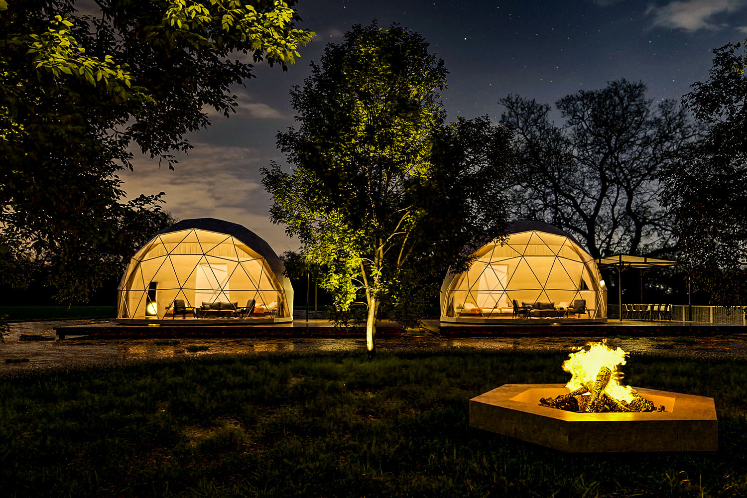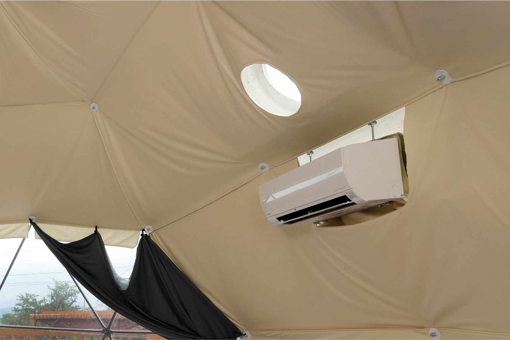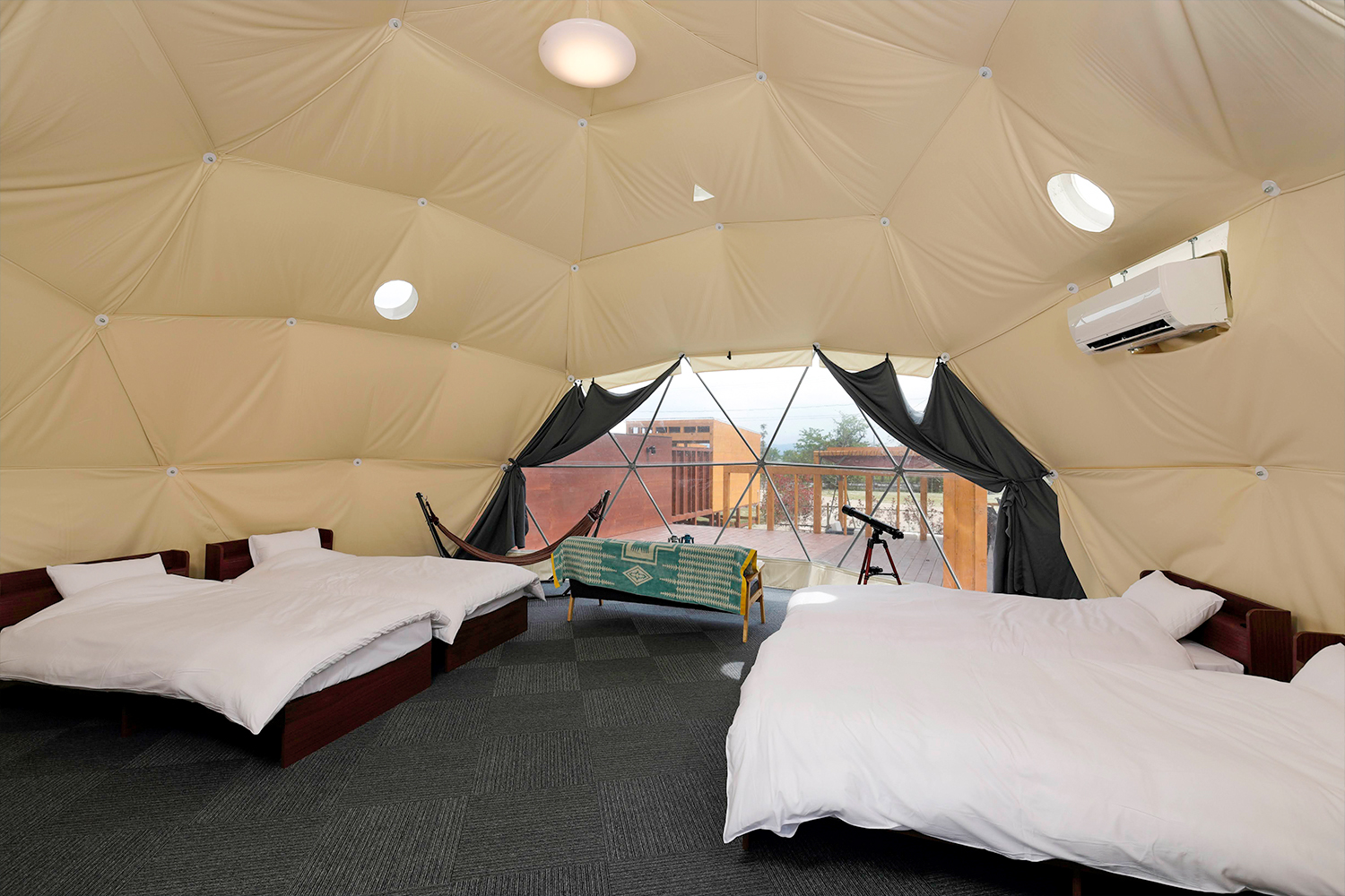 แบบที่ 2 คือเต็นท์โดมสูง 7 เมตร เหมาะกับครอบครัวที่มีลูกๆ วัยกำลังซน ที่อาจจะอยากนอนแยกเตียงกับคุณพ่อคุณแม่ หรือกลุ่มนักท่องเที่ยวขนาดเล็ก มีทั้งหมด 2 ห้อง สามารถเข้าพักได้สูงสุด 6 คนเช่นเดียวกัน