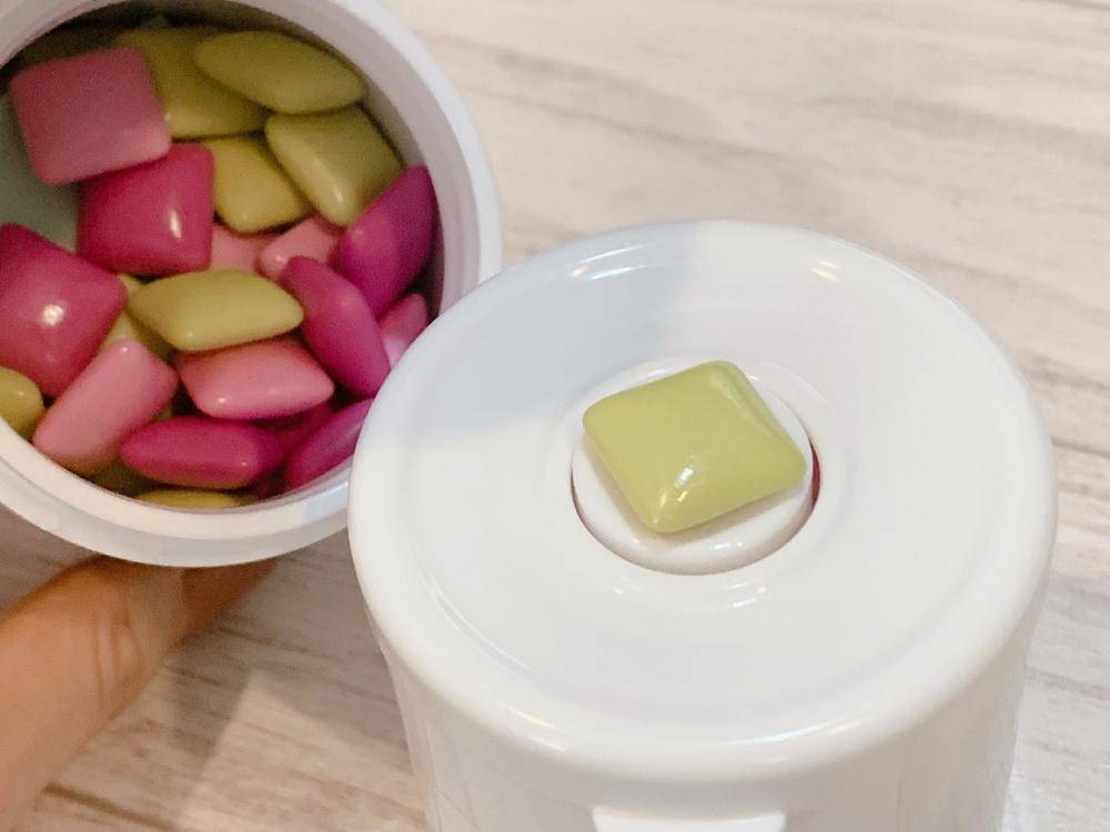 เพียงเท่านี้หมากฝรั่ง 1 ก้อนก็จะเผยโฉมขึ้นมาด้านบนอย่างง่ายดาย เมื่อเราไม่ต้องเอามือล้วงลงไปในโหลที่มีหมากฝรั่งอยู่เยอะๆ ทำให้ไม่ต้องกังวลว่ามือของเราจะเอาเชื้อโรคไปปนเปื้อนหมากฝรั่งที่ยังไม่ได้กิน ถูกสุขอนามัยไปอีก นี่เป็นสาเหตุหลักที่ถูกใจคนญี่ปุ่นเอามากๆ
